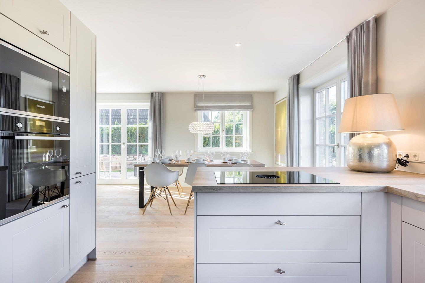 Offene Küche: Moderne und sehr hochwertig ausgestattete Küche mit Bora-Dunstabzug sowie Fenster.