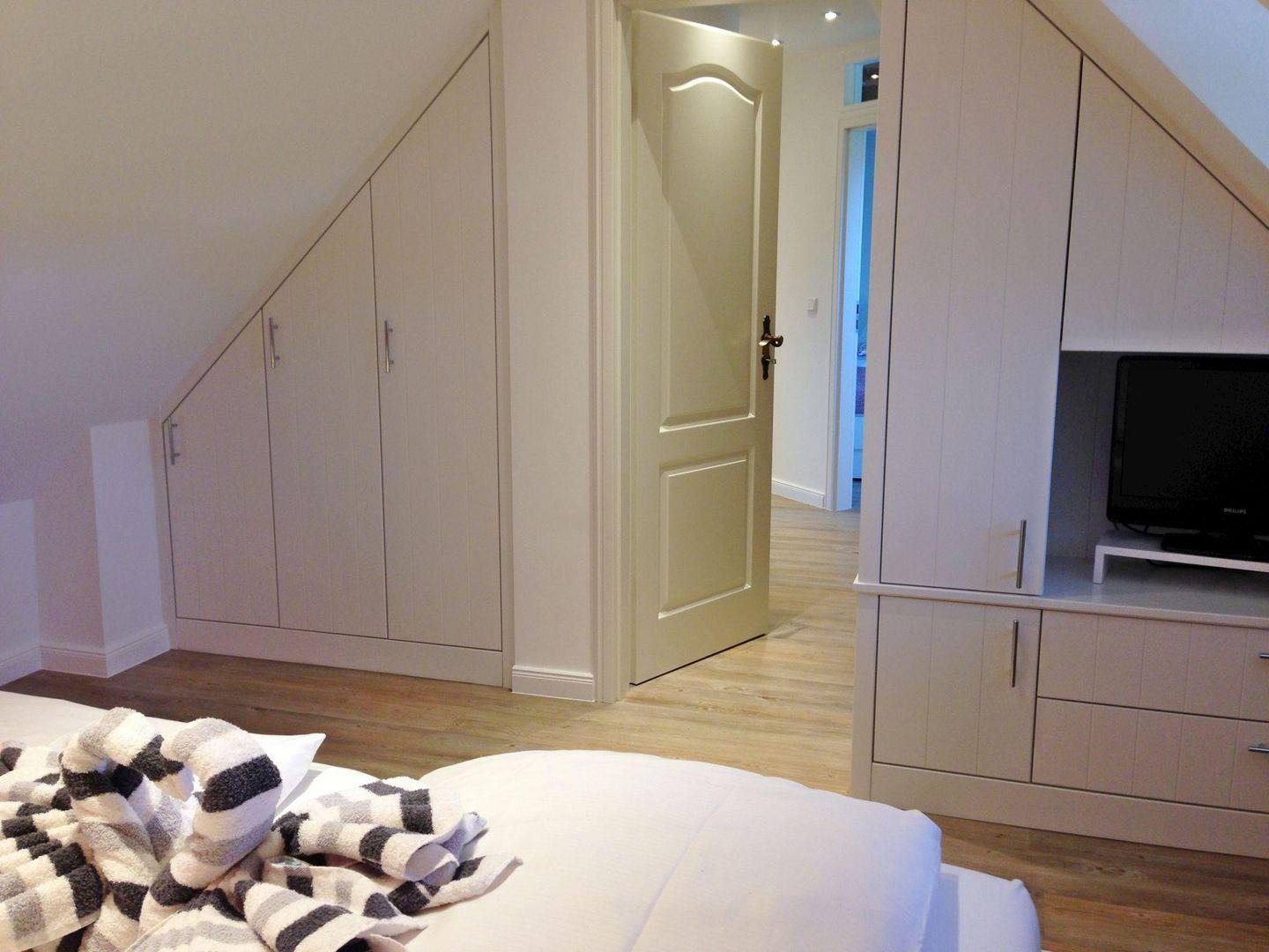Schlafzimmer 2: Doppelbett, TV und Fenster.
