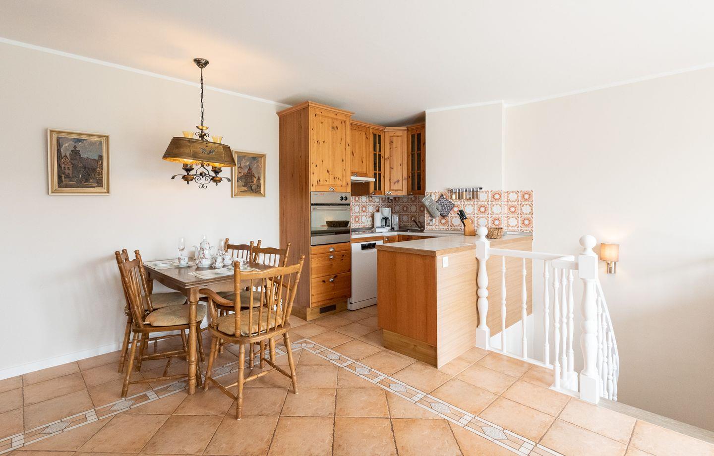 Koch-/Wohn-/Essbereich: Der zur Sonnenseite ausgerichtete, großflächige Wohnbereich mit der offenen Holzeinbauküche und dem Esstisch lädt Sie zum Verweilen ein. Im Wohnzimmer stehen Ihnen die bequemen Sofas und das moderne Sideboard sowie ein Flachbild-TV zur Verfügung. Ein hochwertiges Schlafsofa dient als bequeme Schlafstätte für eine Person. Vom Wohnbereich aus gelangen Sie auch direkt auf die möblierte Terrasse mit angrenzendem Garten.