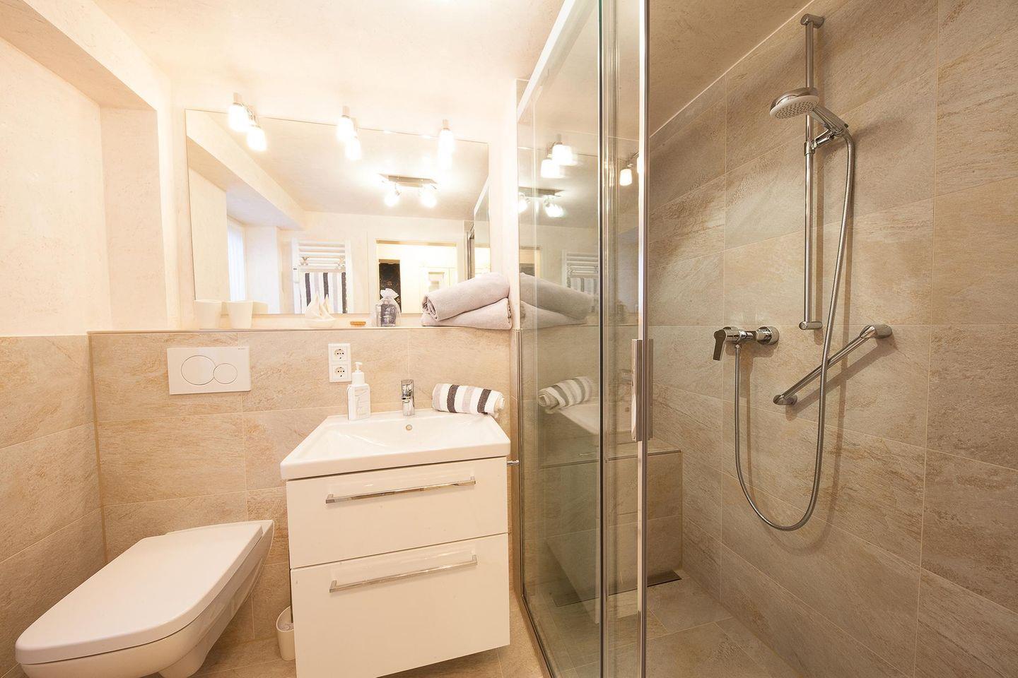 Wohn-/Koch-/Essbereich: Heller Wohnbereich mit offener Küche und einer bequemen Essecke. Außerdem finden Sie hier ein Schlafsofa, einen TV und den direkten Zugang zur Terrasse und dem Garten. In den Sommermonaten steht ein Strandkorb für Sie bereit.