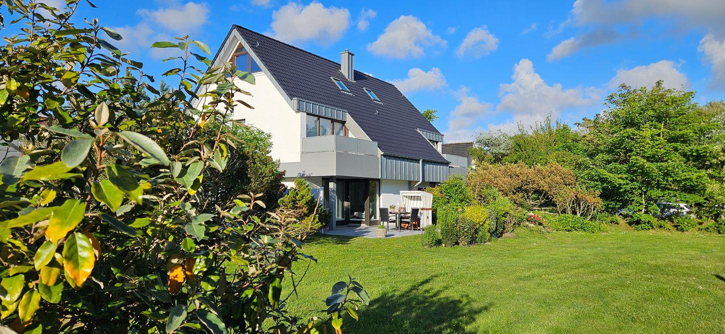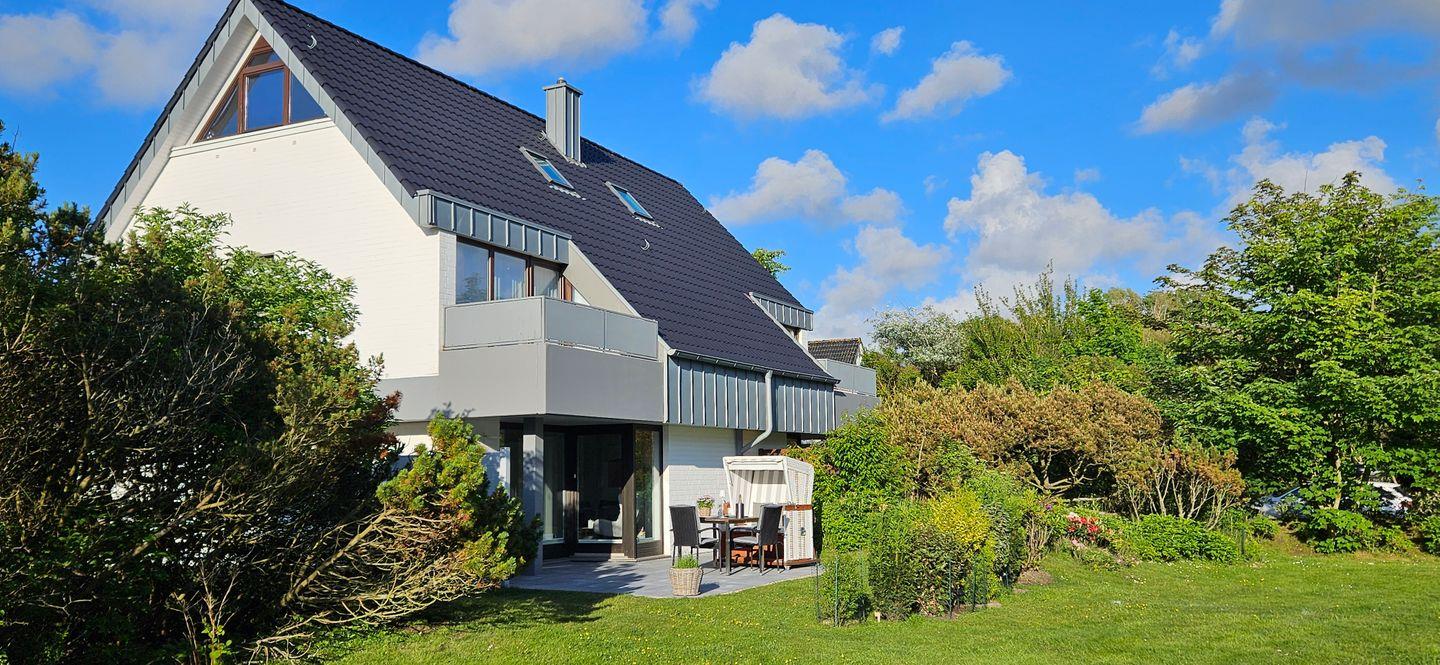 Wohn-/Koch-/Essbereich: Im lichtdurchfluteten Wohnbereich wurde eine Küche integriert und mit einer Essecke im Landhausstil versehen. Der moderne Sitzbereich mit TV und Internet-Radio wurde im Zuge der Renovierung neu gestaltet und lädt zum Verweilen ein. Die großzügige und herrlich gelegene Süd-West Terrasse wurde mit einem Strandkorb und Gartenmöbeln ausgestattet, um die Sonne und Ruhe in vollen Zügen genießen zu können. Ein überdachter Terrassenteil bietet Schatten und Schutz bei Regen.