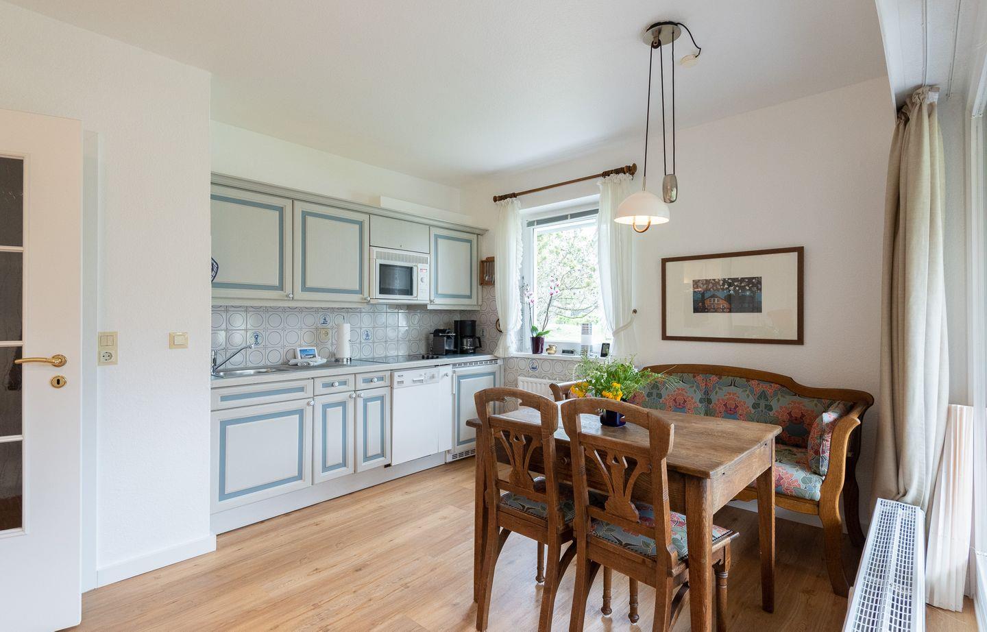 Wohn-/Koch-/Essbereich: Zur Sonnenseite ausgerichteter, großzügiger Wohnbereich mit hochwertigen Sesseln und Sofa. Die Friesenholzküche und der gemütliche Essplatz lassen keine Wünsche offen. Vom Wohnzimmer aus gelangen Sie direkt in den großzügigen Gartenbereich mit Terrasse Richtung Süden und einem Strandkorb.
