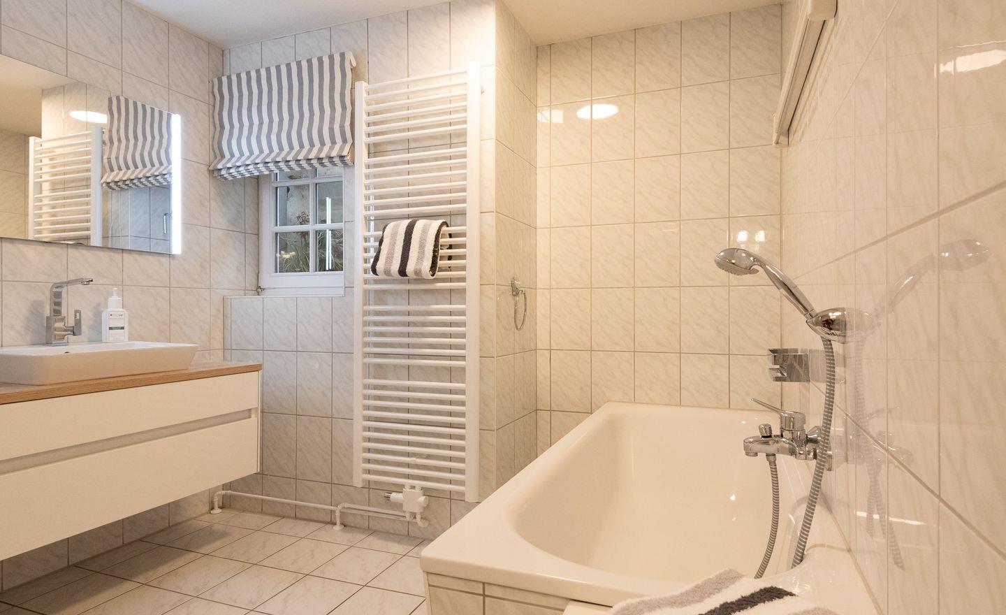Badezimmer: Helles Vollbad ohne WC mit Fenster.