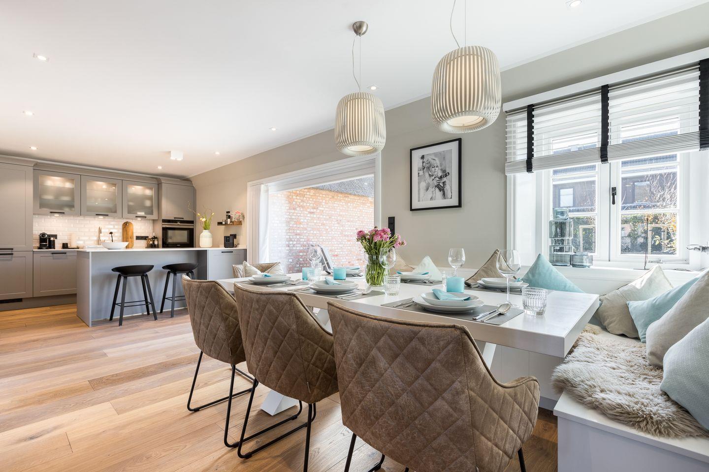 Wohn-/Koch-/Essbereich: Offene und perfekt ausgestattete Küche mit Bora-Dunstabzug und angrenzender gemütlicher Essecke. Im Wohnbereich erwarten Sie eine bequeme Wohnlandschaft, TV und Gas-Kamin. Ebenfalls gelangen Sie von hier aus in Ihren eigenen Garten mit Süd-Terrasse, hochwertigen Gartengestühl und Strandkorb. Das gesamte Domizil wird mit Erdwärme umweltfreundlich beheizt.