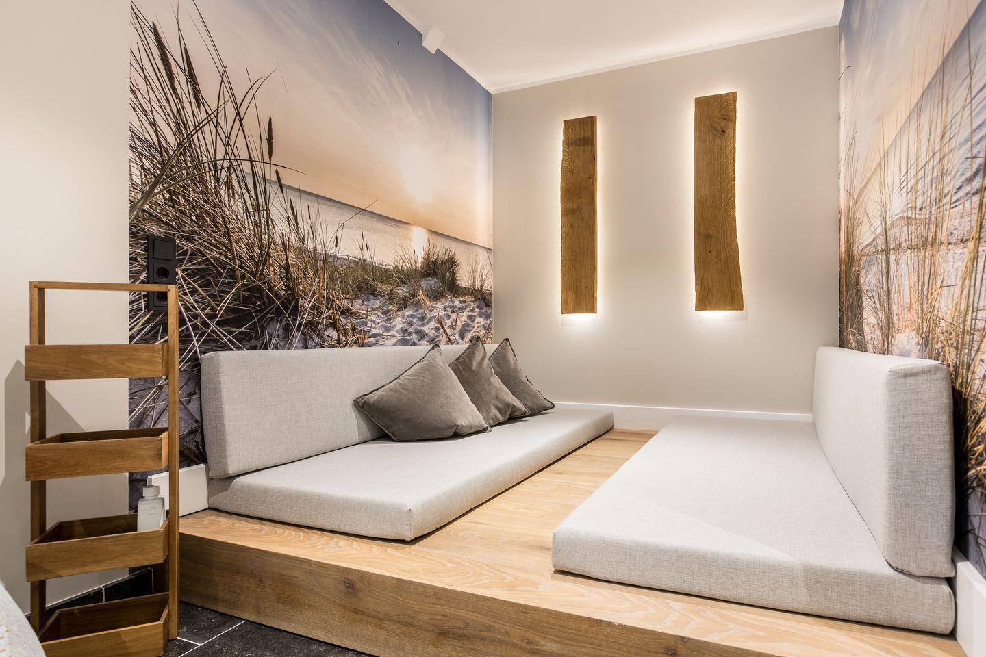 Luxus-Mittelhausteil unter Reet auf ca. 167m² Wohnfläche für bis zu 6 Personen mit einem großen Wellnessbereich mit Sauna, eigenem Garten und hochwertiger Einrichtung.