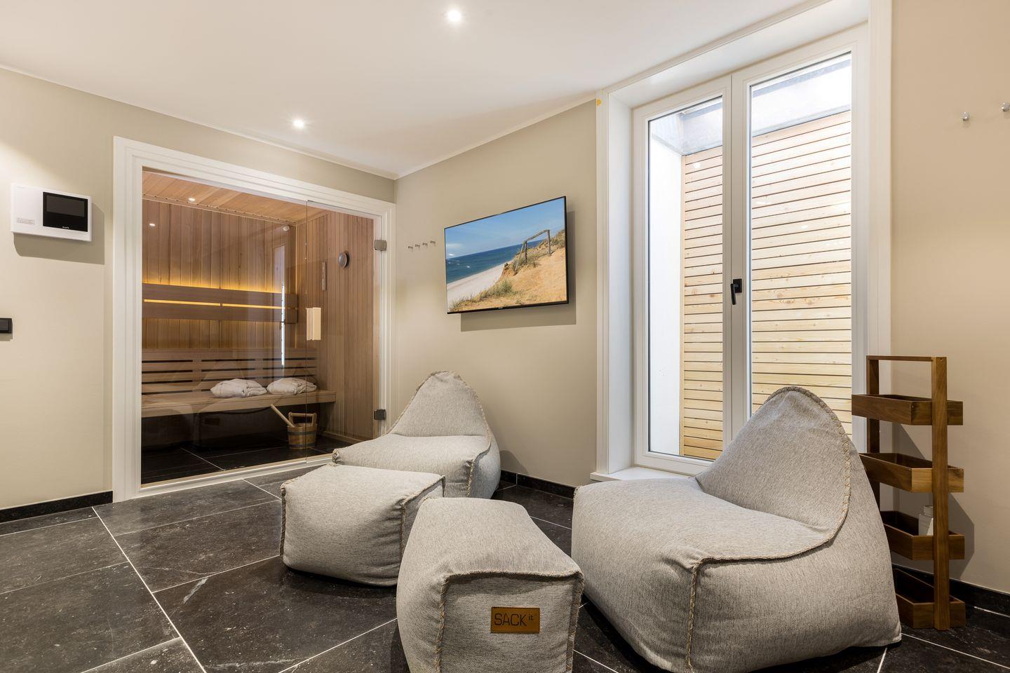 Wellnessbereich: Große Sauna, Kneipp-Schlauch, Dusche, WC, Radio, Ruheliegen und TV.