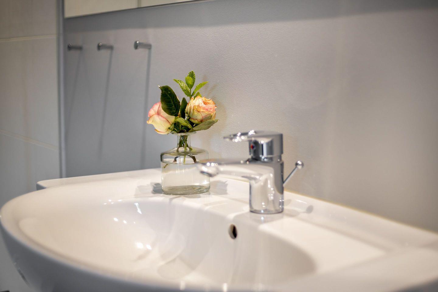 Das Badezimmer ist modern eingerichtet und verfügt über eine Dusche, WC, Föhn und Handtuchwärmer. Die hochwertige Ausstattung sorgt für einen frischen Start in den Tag.