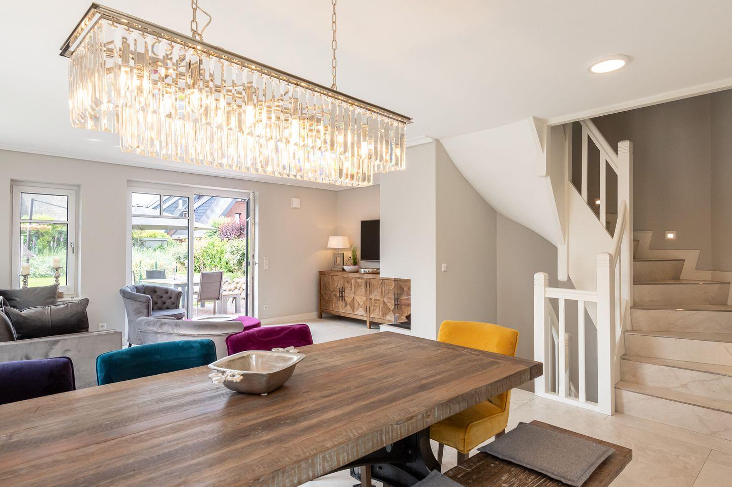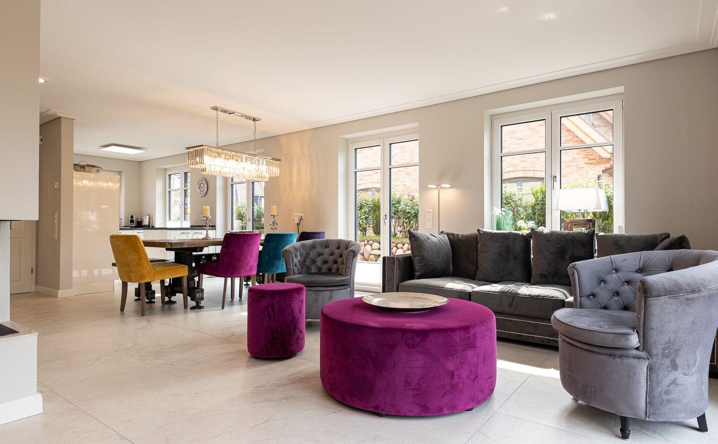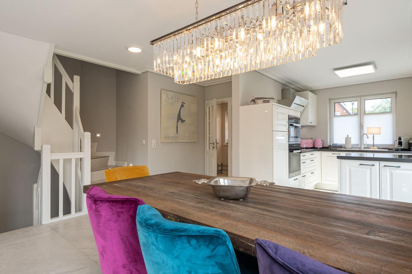 Über einen geräumigen Hausflur mit Garderobe gelangen Sie in den modernen Küchen- und Wohnbereich. Die helle und hochwertige, top ausgestattete, offene Küche lässt für Hobbyköche keine Wünsche offen. Der Esstisch bietet mit besonderer Bestuhlung Platz für bis zu 7 Personen und grenzt die Küche perfekt vom Wohnbereich ab. Der Wohnbereich überzeugt mit seiner bequemen Sitzgruppe, großem TV, Gaskamin und Blick in den Garten.