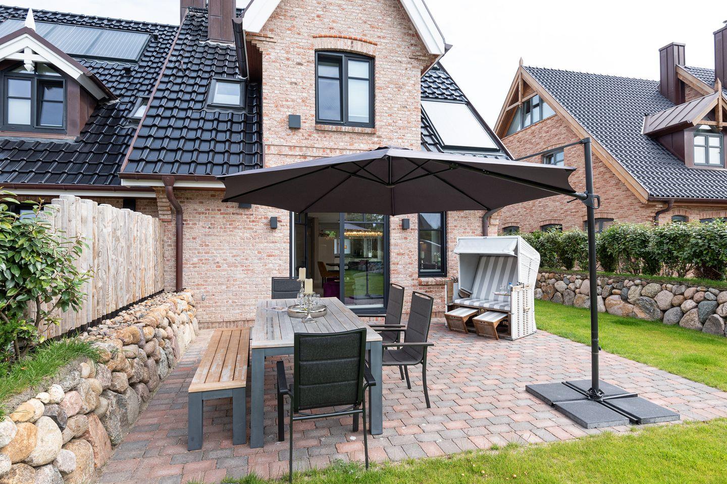 Vom Wohnbereich haben Sie Zugang zur sonnigen und ruhigen Südterrasse mit Gartenmöbeln, Saisonstrandkorb (April - Okt.) und Sonnenschirm.