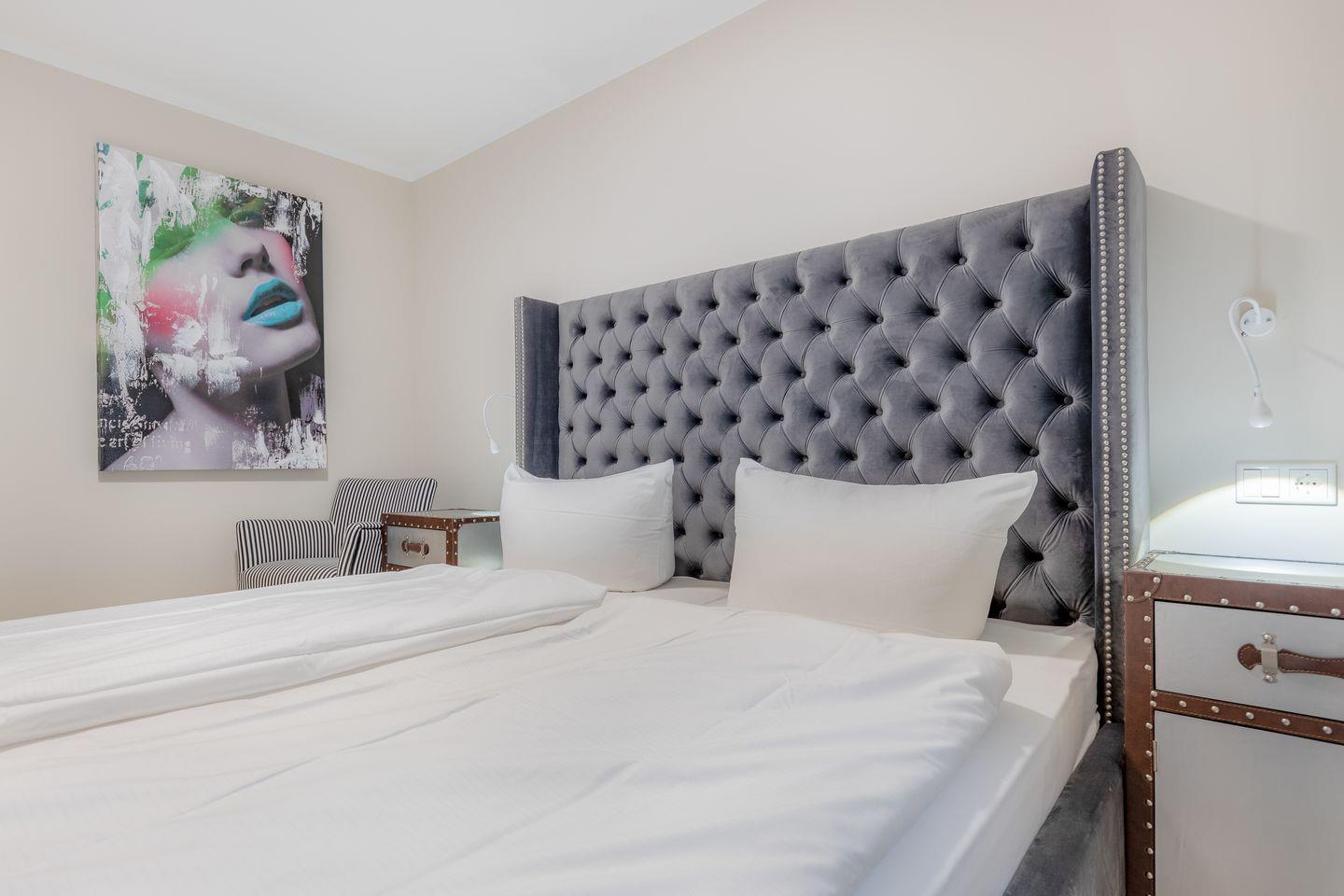 Drei Doppelschlafzimmer mit TV und Kleiderschrank. Ein weiteres Schlafzimmer mit einem Einzelbett, TV und Kleiderschrank. Alle Betten sind mit hochwertigen Matratzen und komfortablen Oberbetten ausgestattet. Die Schlafzimmer lassen sich hervorragend abdunkeln und bieten hohen Schlafkomfort.