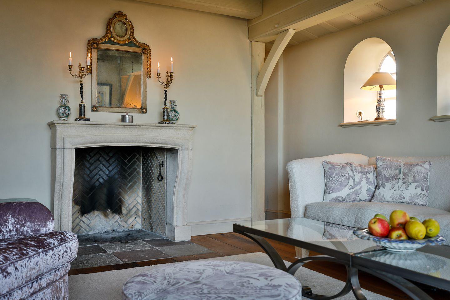 Kaminzimmer: Dieses geräumige Zimmer besticht nicht nur durch den offenen Kamin. Eine große torförmige Panoramascheibe ermöglicht einen sagenhaften Blick auf die Heidelandschaft, den Kampener Leuchtturm sowie auf das Wattenmeer bis hin nach List. Der Kamin ist nicht benutzbar.