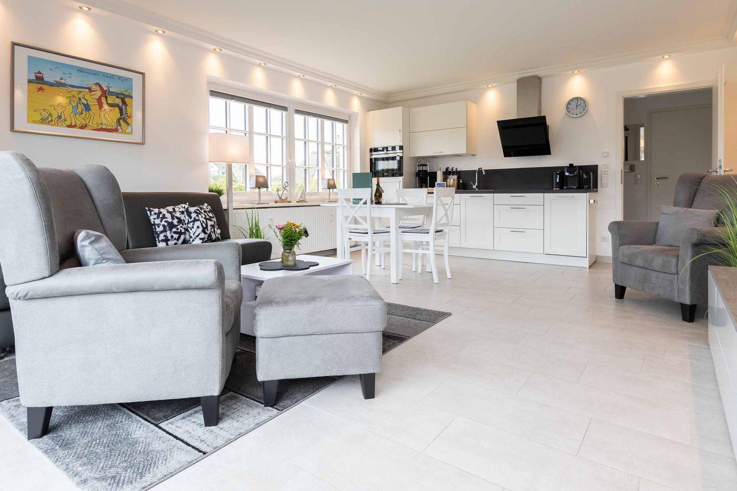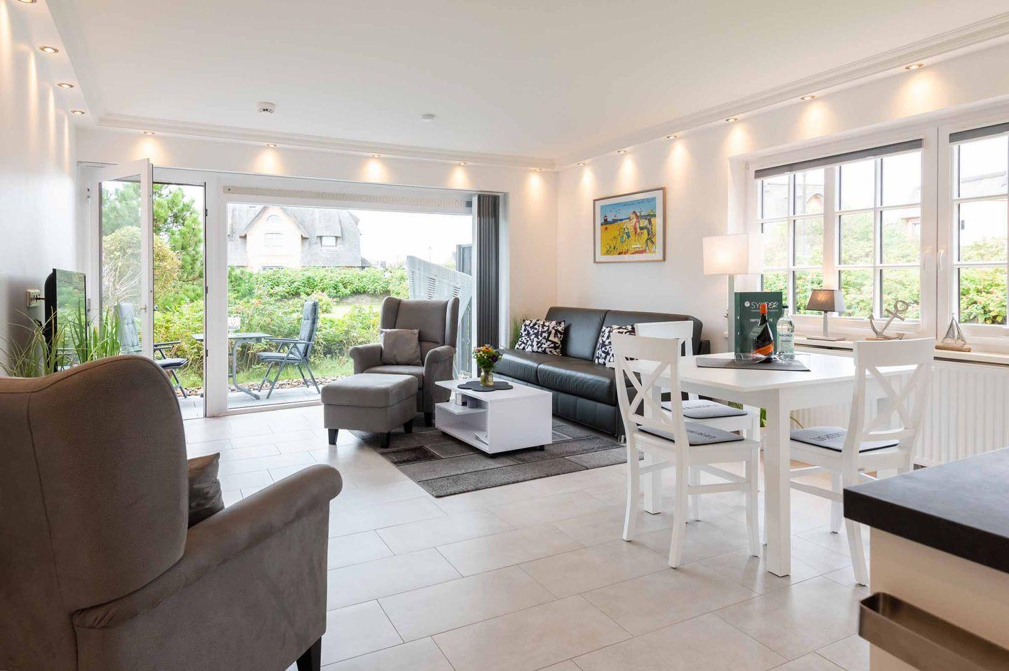 Koch-/Wohn-/Essbereich: Neben der modernen und gut ausgestatteten Küchenzeile befindet sich der Esstisch für 3 Personen. Eine komfortable Sofaecke mit hochwertiger Schlafcouch (1,60 x 2,00 m) inkl. TV runden den Wohnbereich ab. Die großen Fenster und der Ausgang auf die eigene möblierte West-Terrasse mit Saison-Strandkorb laden zum Urlaub machen ein.