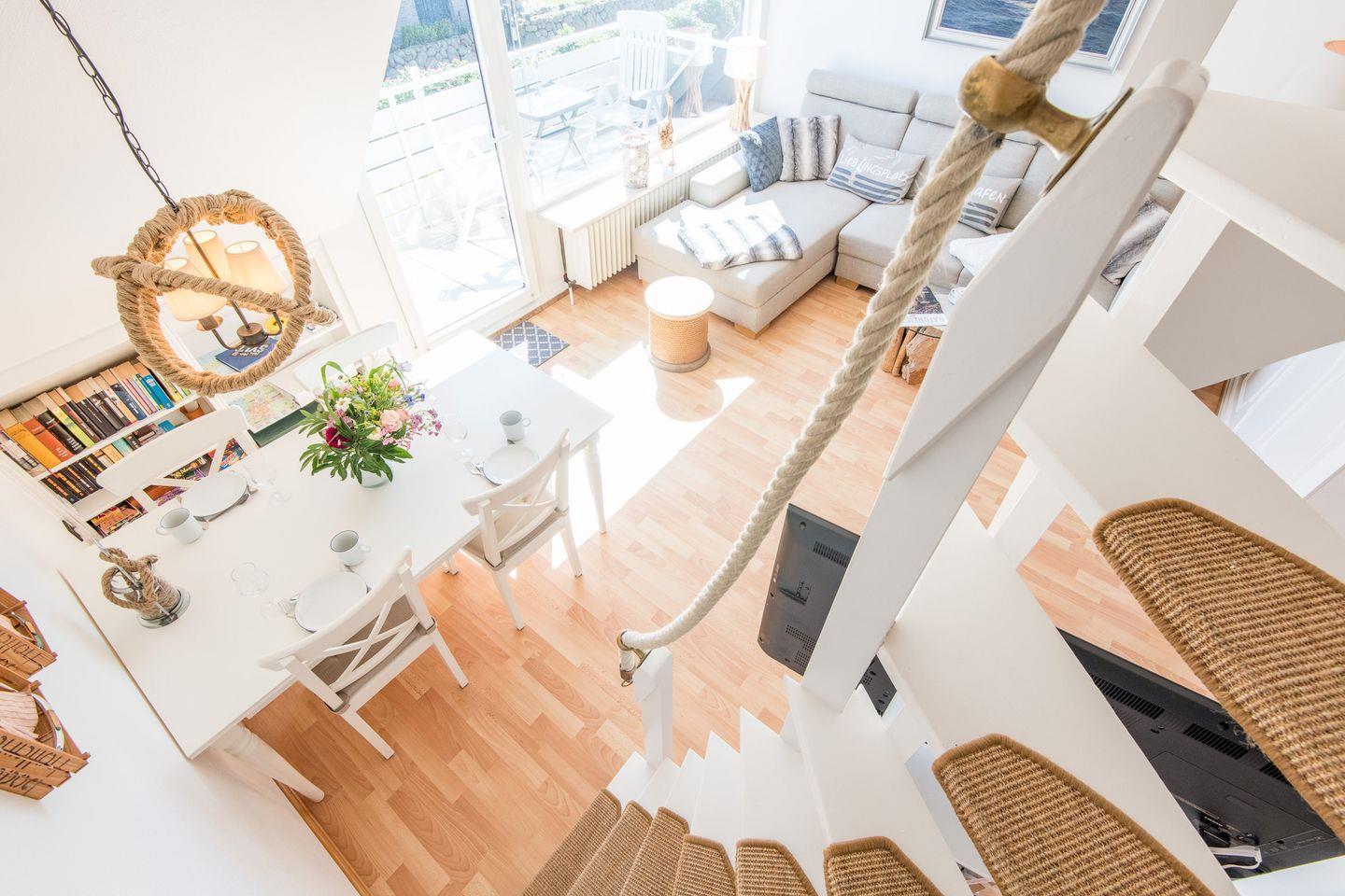 Koch-/Wohn-/Essbereich: Der gemütliche Wohnbereich mit Sofaecke und TV lädt zum Verweilen ein. Die offene Küche im Landhausstil wurde perfekt in den Raum integriert und grenzt sich durch einen Küchentresen optisch vom Wohnbereich ab. Der helle Essbereich bietet Platz für bis zu 4 Personen. Von hier haben Sie ebenfalls Zugang zu dem möblierten Süd-Balkon.