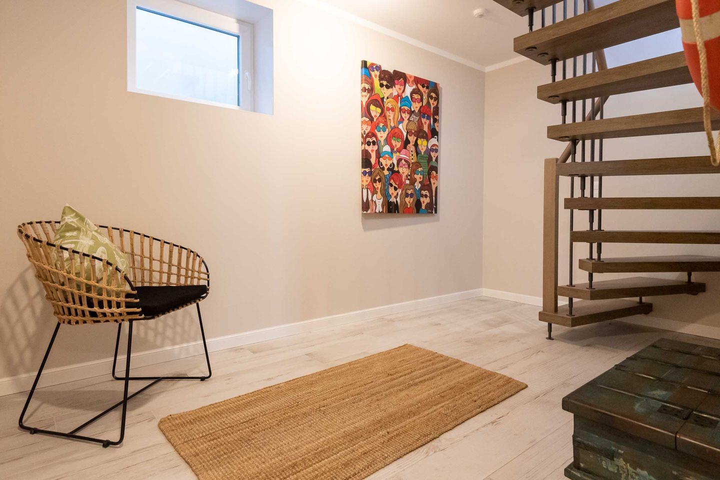 Das Treppenhaus zum großzügigen Untergeschoss/Warftgeschoss wird durch eine Schiebetür vom Wohnraum abgetrennt, hier erwartet Sie: