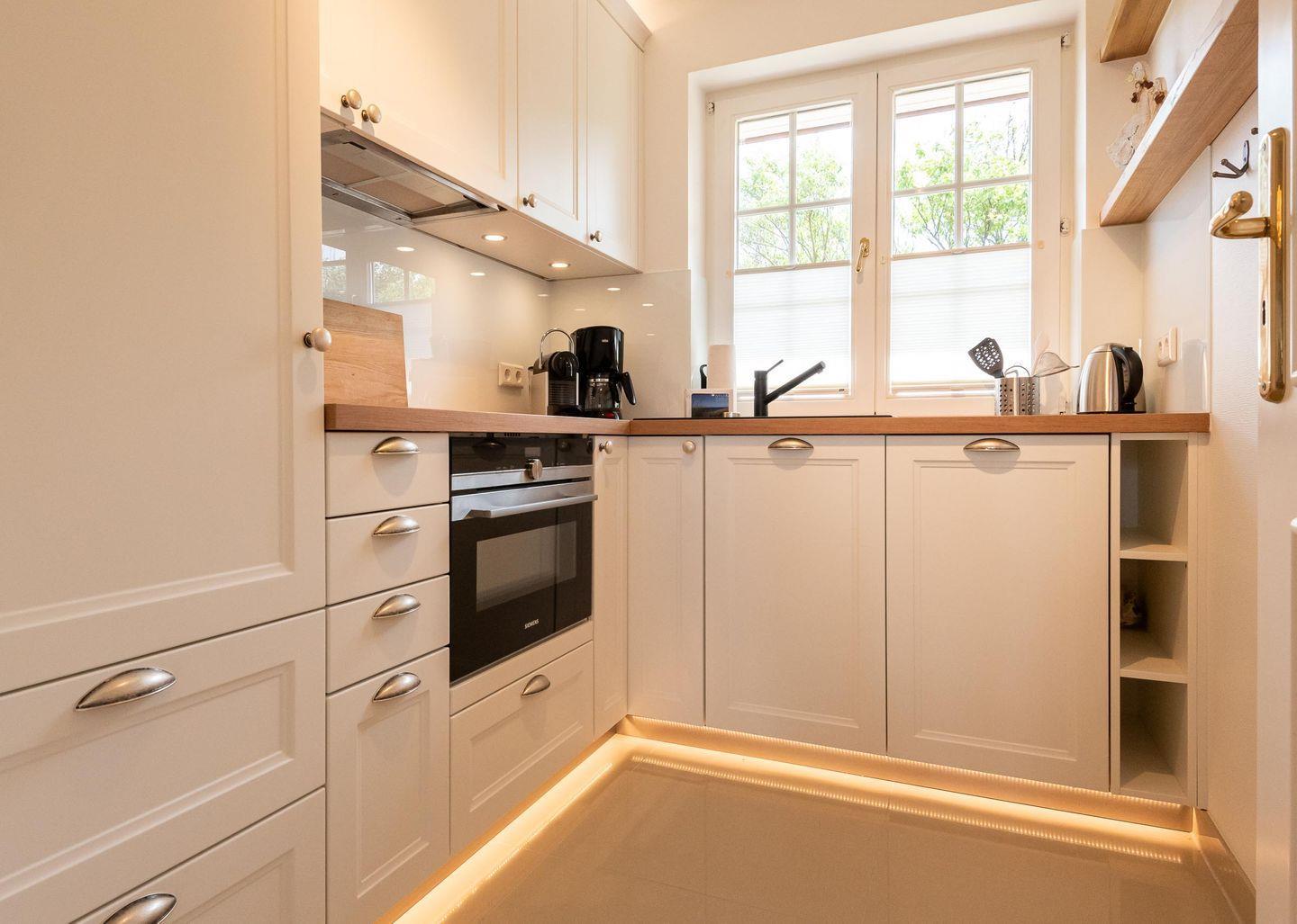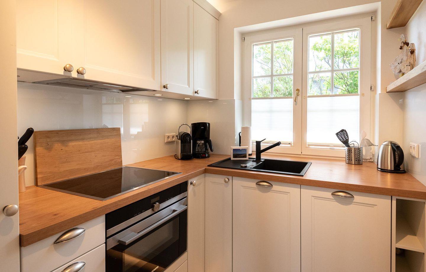 Im lichtdurchfluteten Erdgeschoss befindet sich ein kleiner Flur mit Garderobe und die gut ausgestattete, abgeschlossene Küche mit direktem Durchgang zum Wohn- und Essbereich: