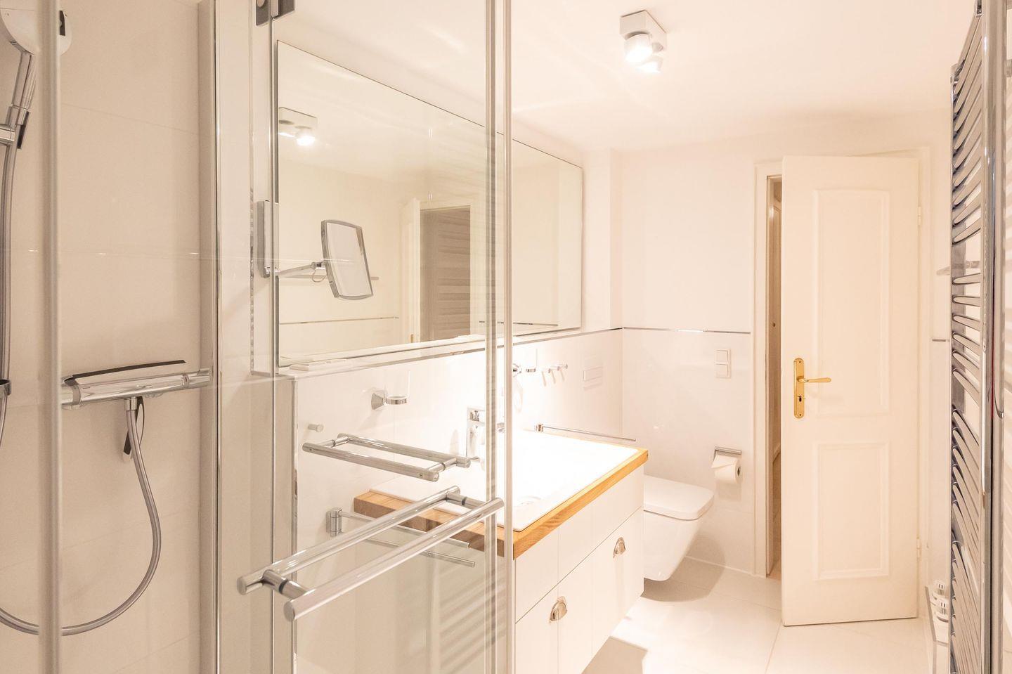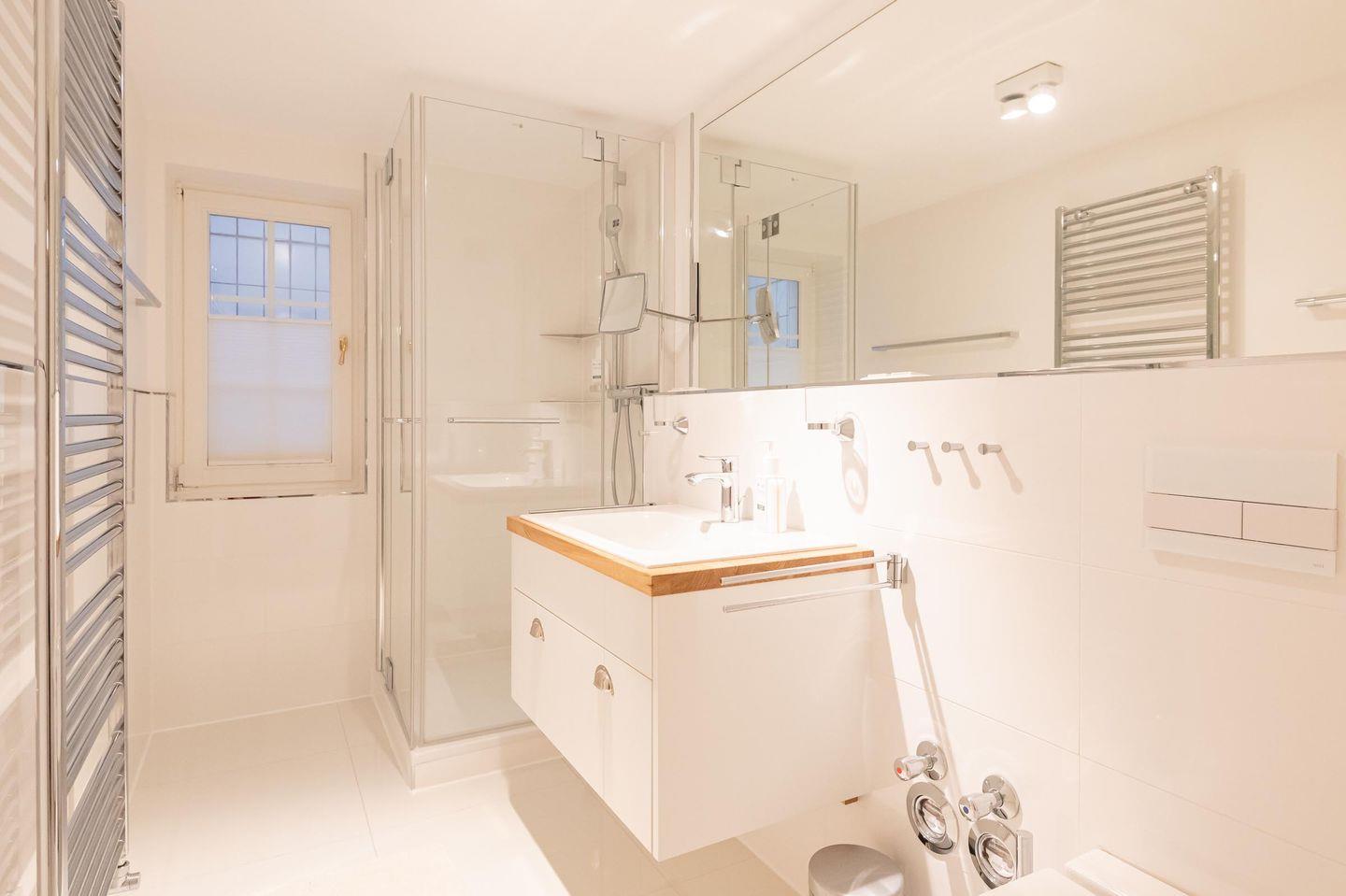 Badezimmer: Helles und modernes Bad mit Fußbodenheizung, bodentiefer Dusche, Handtuchtrockner und Fenster.