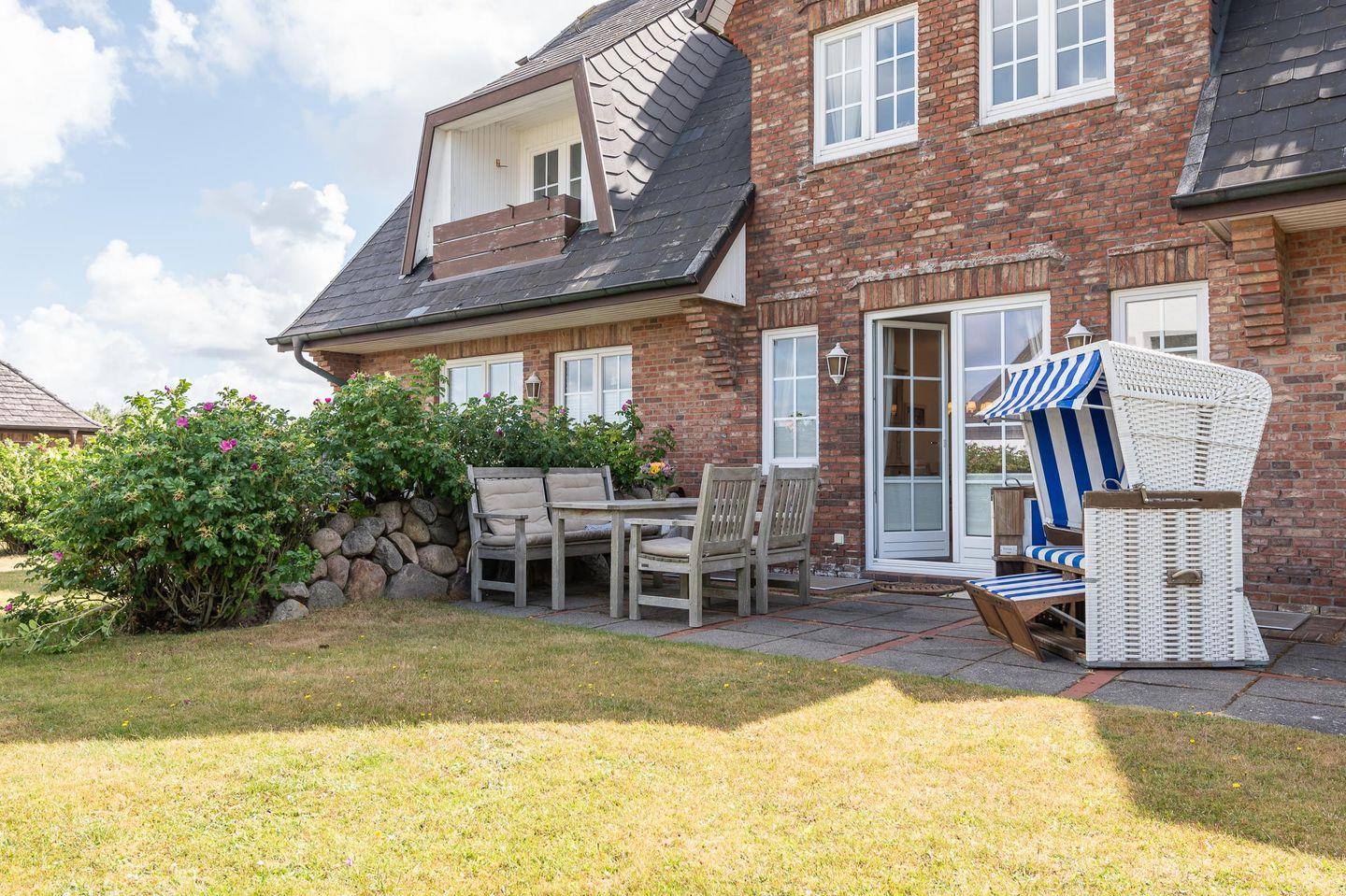 Über eine Terrassentür gelangen Sie vom Wohnzimmer aus auf die sonnige und möblierte West-Terrasse mit Ganzjahresstrandkorb.