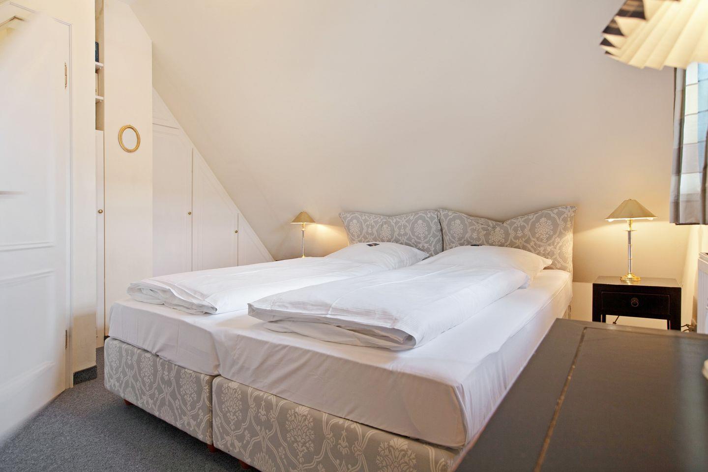 Über die Treppe erreichen Sie das Dachgeschoss mit einem gemütlichen Doppelbett. Die Wohnung ist mit ihrer Lage der perfekte Ausgangspunkt für eine Entdeckungsreise über die Insel Sylt – Sie erreichen in wenigen Autominuten die Orte Westerland oder Kampen und auch durch die öffentlichen Verkehrsmittel finden Sie hier jederzeit eine gute Anbindung.