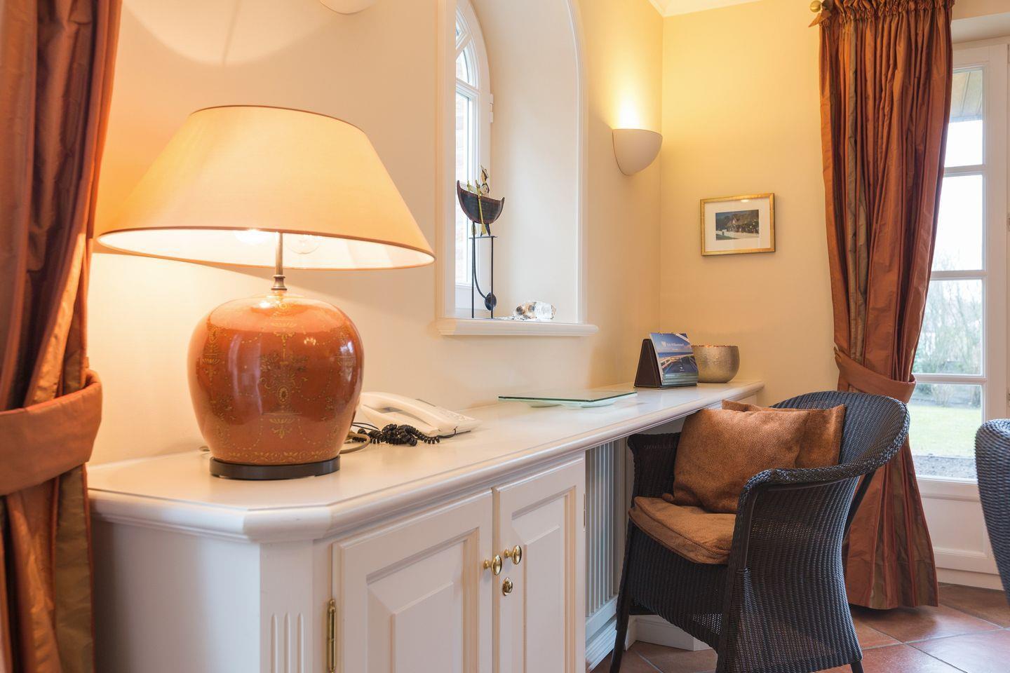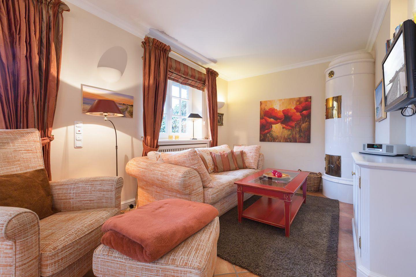 EG: Wohnraum mit Flatscreen-TV, DVD-Player, CD-Player, Telefonflatrate ins deutsche Festnetz und Radio, antiker Kachelofen, Essbereich für sechs Personen, integrierte Küche mit Geschirrspülmaschine, Backofen, Wasserkocher und Kaffeemaschine, Gartenterrasse mit Strandkorb (ca. April-Oktober) und hochwertigen Gartenmöbeln, Gartenhaus. Gäste WC separat vorhanden.