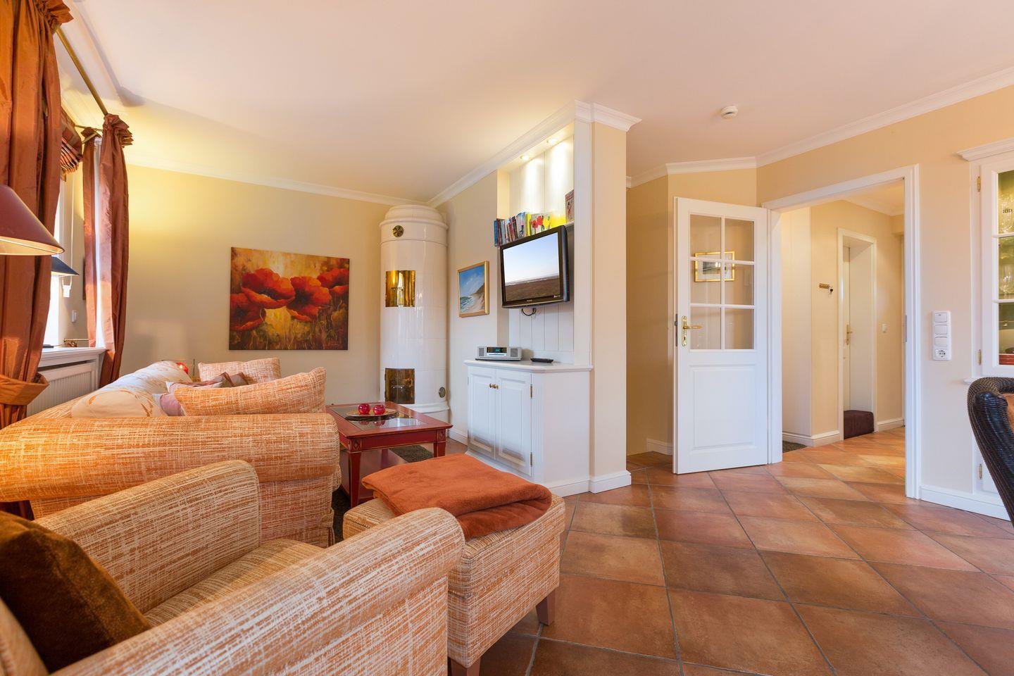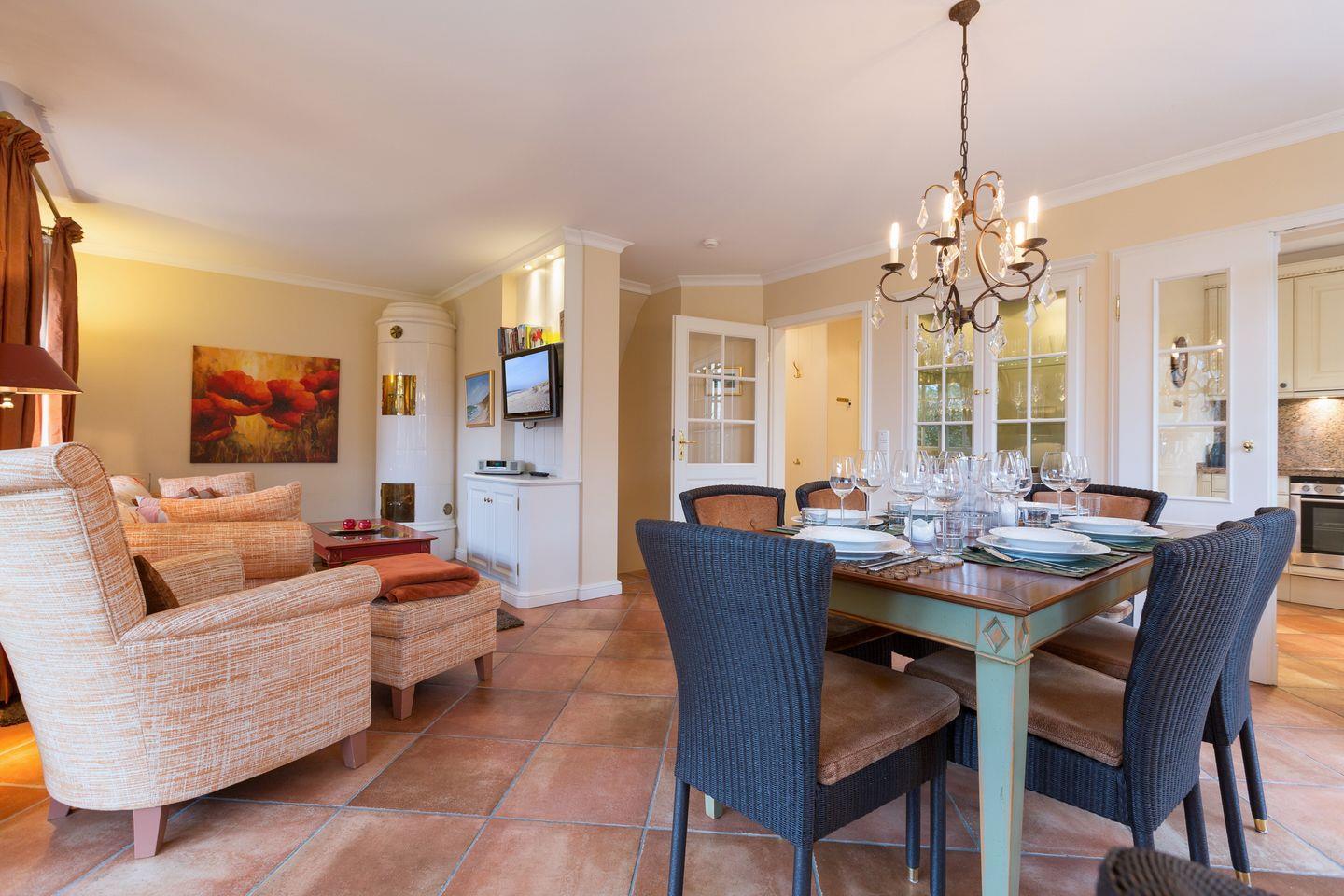 Im großen Wohnbereich erwartet Sie eine geschmackvolle Einrichtung. Vom gemütlichen Sofa aus schauen Sie auf den antiken Kachelofen und der Essbereich bietet genügend Platz für bis zu sechs Personen. Die Küche ist geschickt durch eine Glastür vom Wohnbereich getrennt und bietet Ihnen mit ihrer vollen Ausstattung alles, was Ihr Urlaubsherz begehrt.