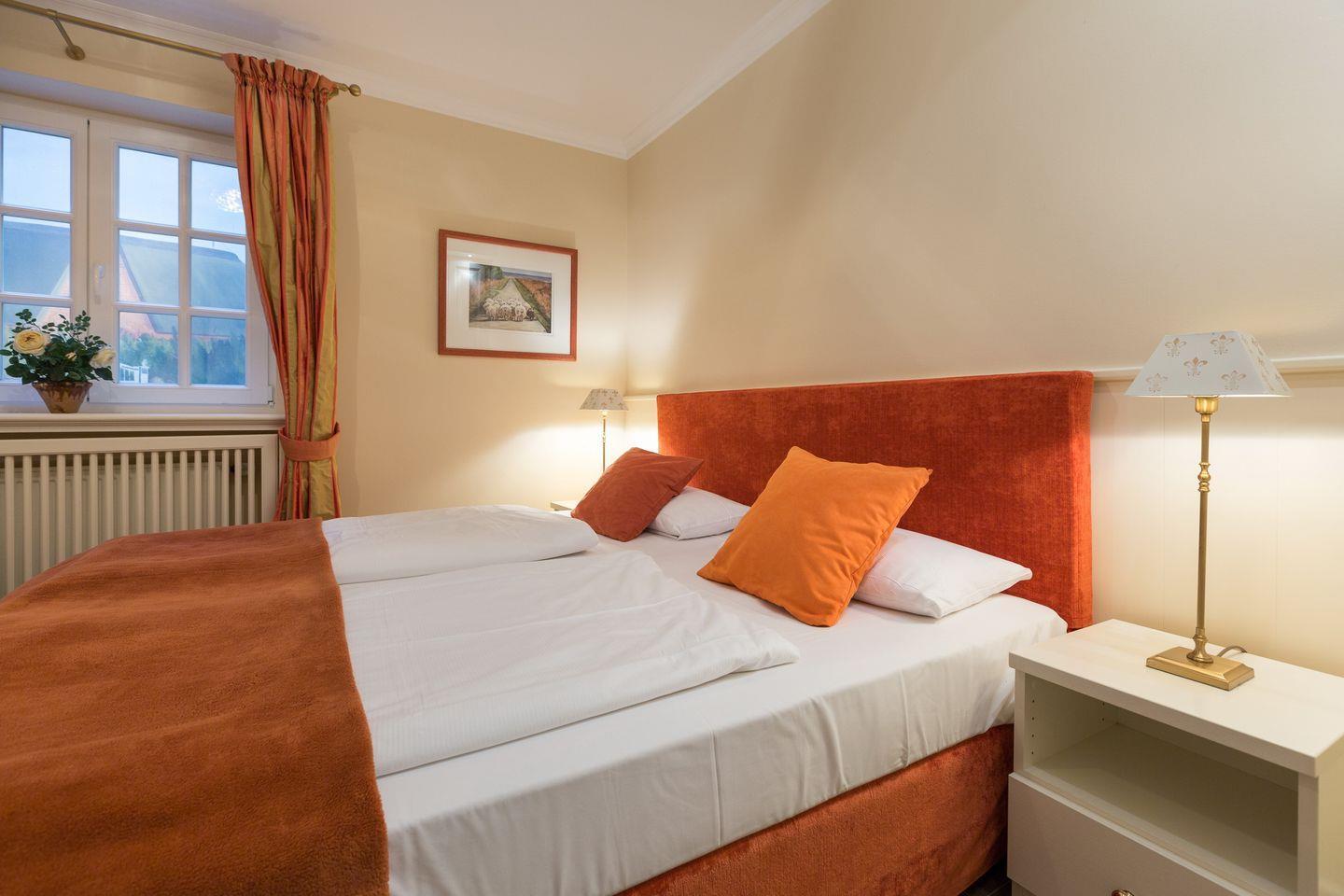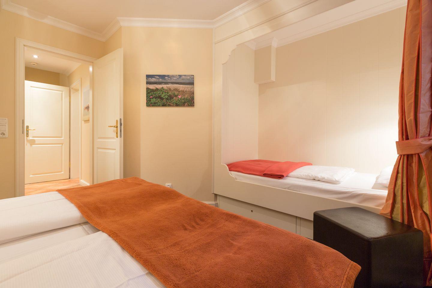 Im Untergeschoss der Wohnung befinden sich zwei gemütliche Räume mit jeweils einem Doppelbett. In einem der Räume finden Sie außerdem ein weiteres Einzel-Kojenbett, in dem sich vor allem ein Kind sicherlich wohlfühlen wird. Auf gleicher Ebene bietet Ihnen das Domizil ein Wohlfühlbadezimmer mit Sauna, Dusche und WC sowie ein weiteres Badezimmer mit Badewanne, Dusche und WC.