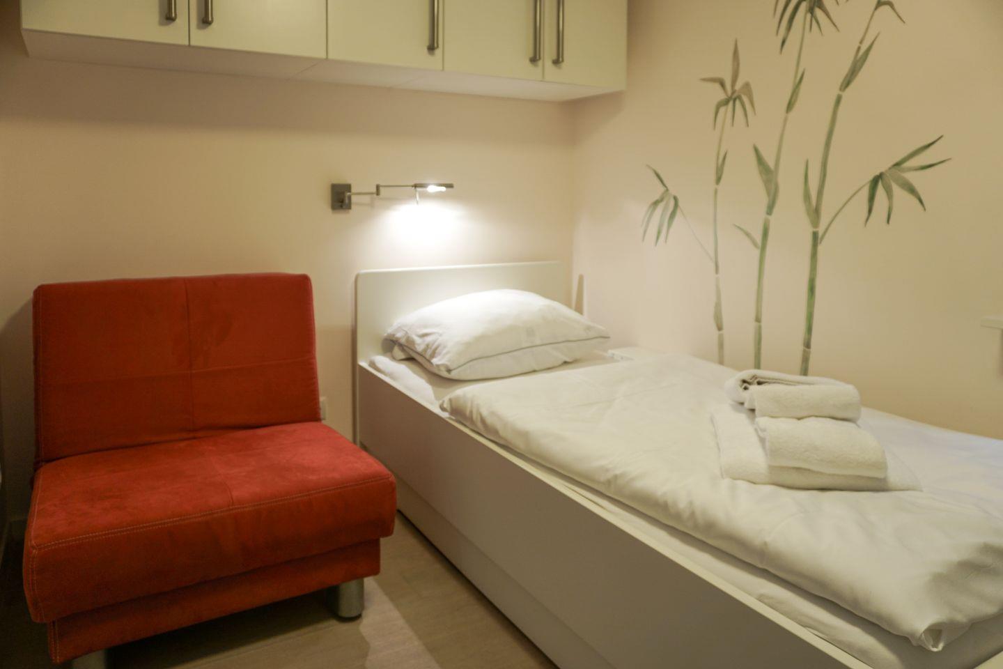UG: ein Raum mit Doppelbett (180x200cm), ein Raum mit Einzelbett (80x190cm) und Flatscreen-TV, Badezimmer mit Dusche und WC