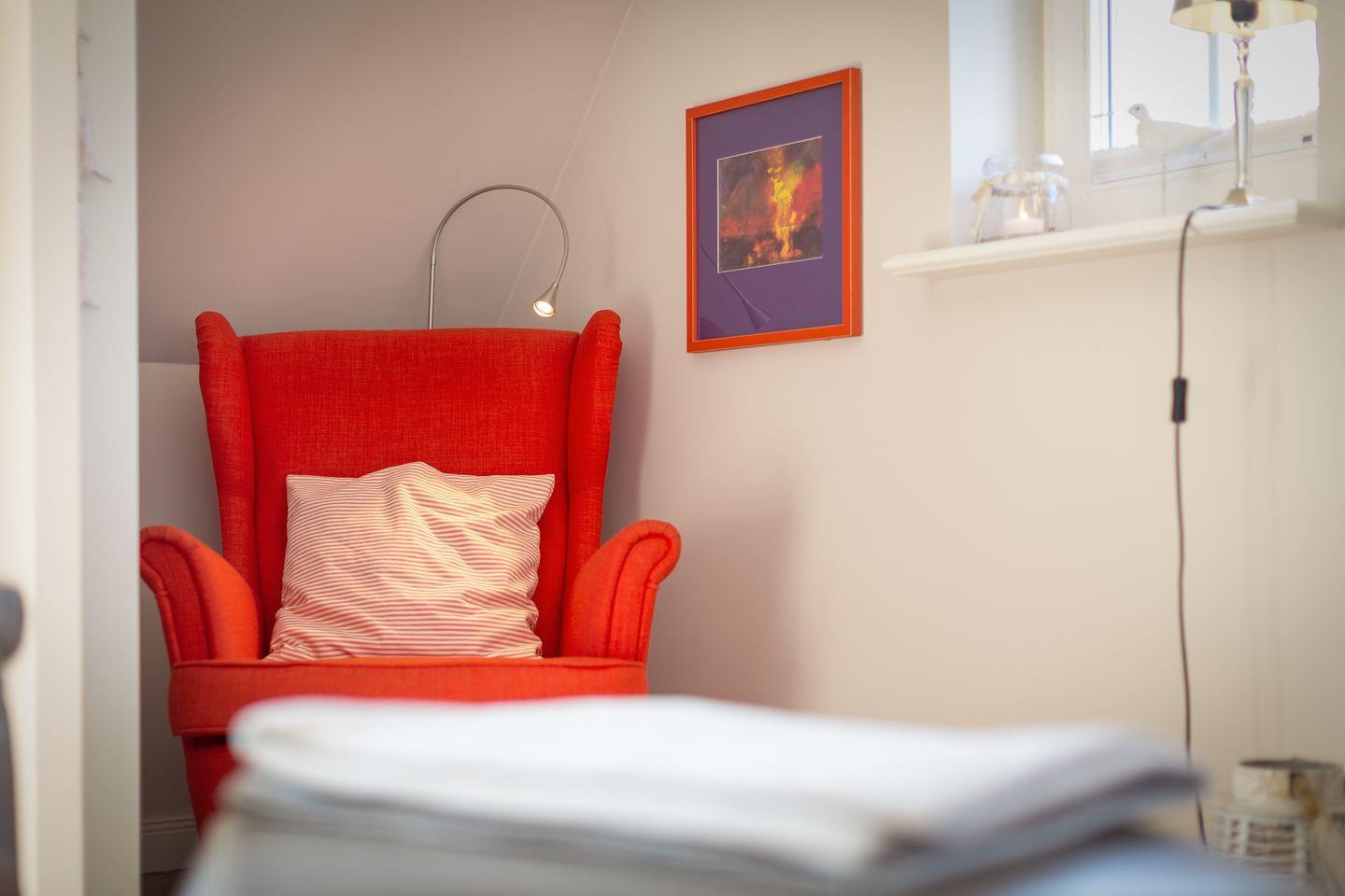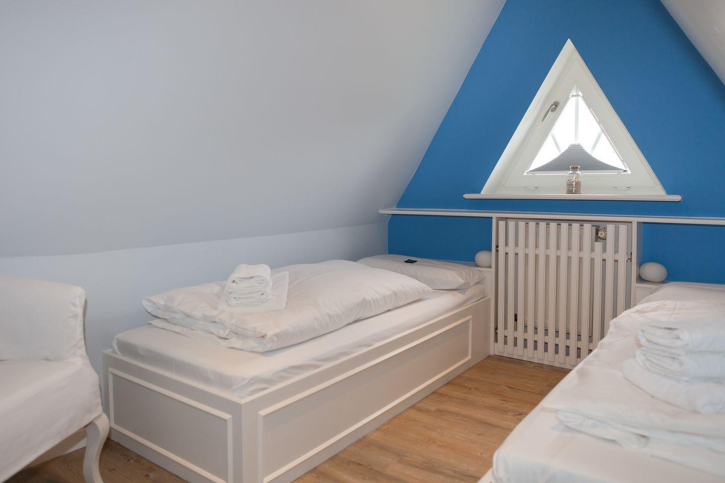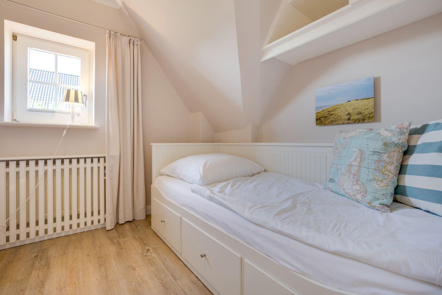 Direkt gegenüber steht ein zusätzliches Schlafzimmer (80x200cm) mit kleinem Schreibtisch und Einbauschrank für Sie zur Verfügung, das auch tagsüber als angenehmer Rückzugsort dienen kann.