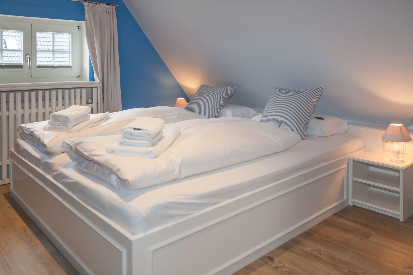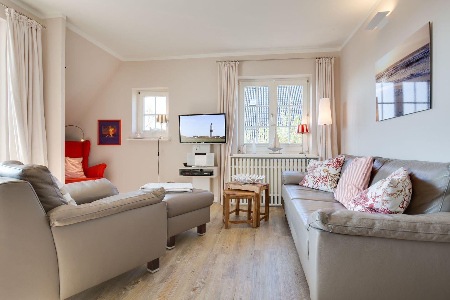 In Ihrem Domizil erwartet Sie auf ca. 80 qm komfortables Wohnen auf zwei Ebenen. Es wurde Anfang 2014 für Sie neu und sehr geschmackvoll gestaltet. Hier verbinden sich modernes Design und maritime Elemente. Das stimmige und unaufdringliche Farbkonzept vermittelt entspannte Urlaubsatmosphäre. Geschickt integrierte Einbauschränke sowie eine Abstellkammer im Dachgeschoss bieten großzügigen Stauraum.