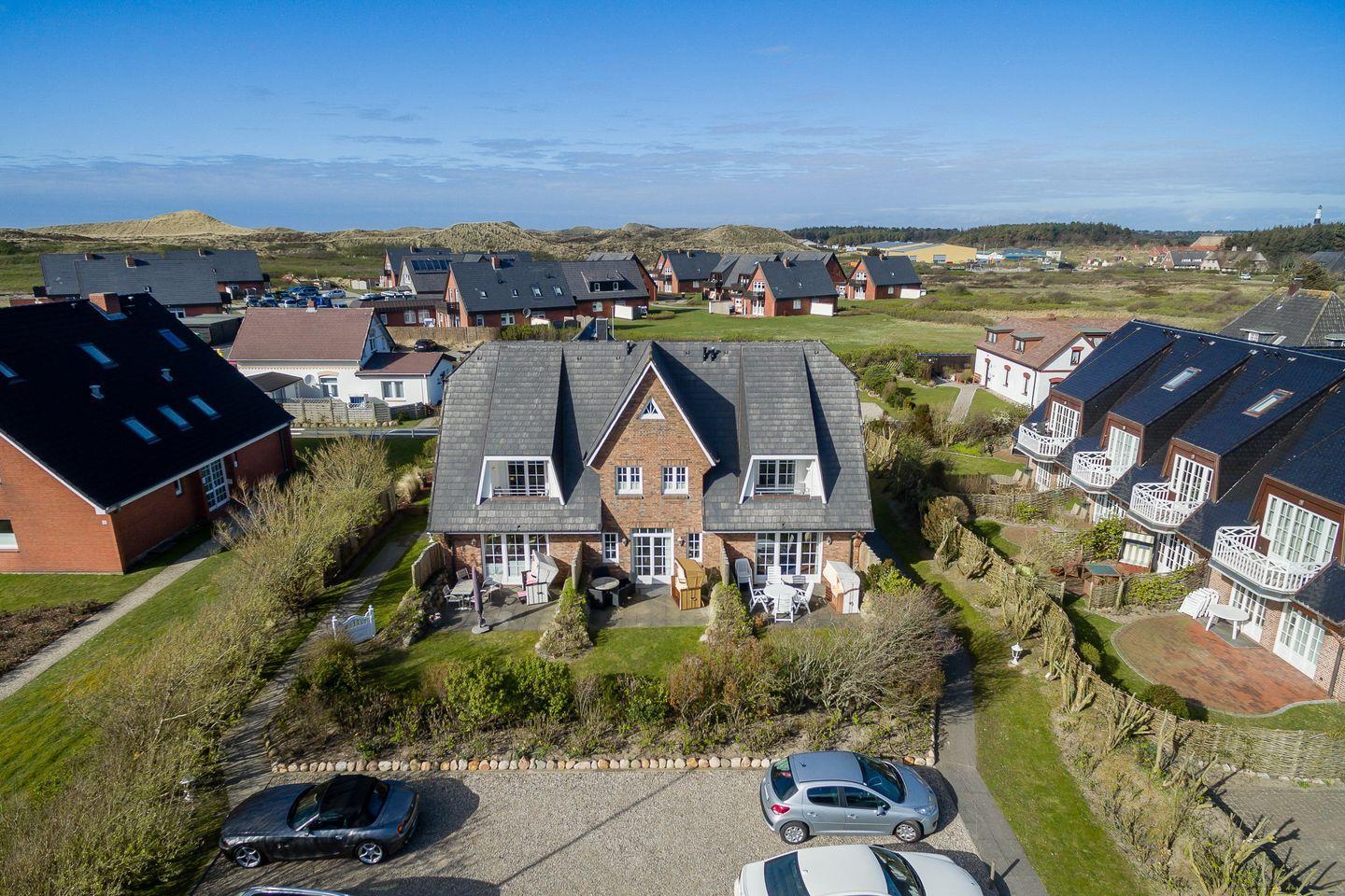 Ihr Domizil befindet sich zwischen Dorfteich und Dünen in Ideallage: Die Annehmlichkeit, vielfältige Einkaufsmöglichkeiten und viele Restaurants Wenningstedts fußläufig erreichen zu können, verbindet sich hier mit einer ruhigen Lage und einer kurzen Entfernung zum Strand: Hören und riechen Sie das Meer auf dem geschützten Südbalkon. In Ihrer mit Heckenrosen gesäumten Sonnenmulde im Garten steht Ihnen in der Zeit ca. von April bis Oktober ein Strandkorb zur Verfügung – ein einladender Platz zum Frühstück oder einfach zum Entspannen.