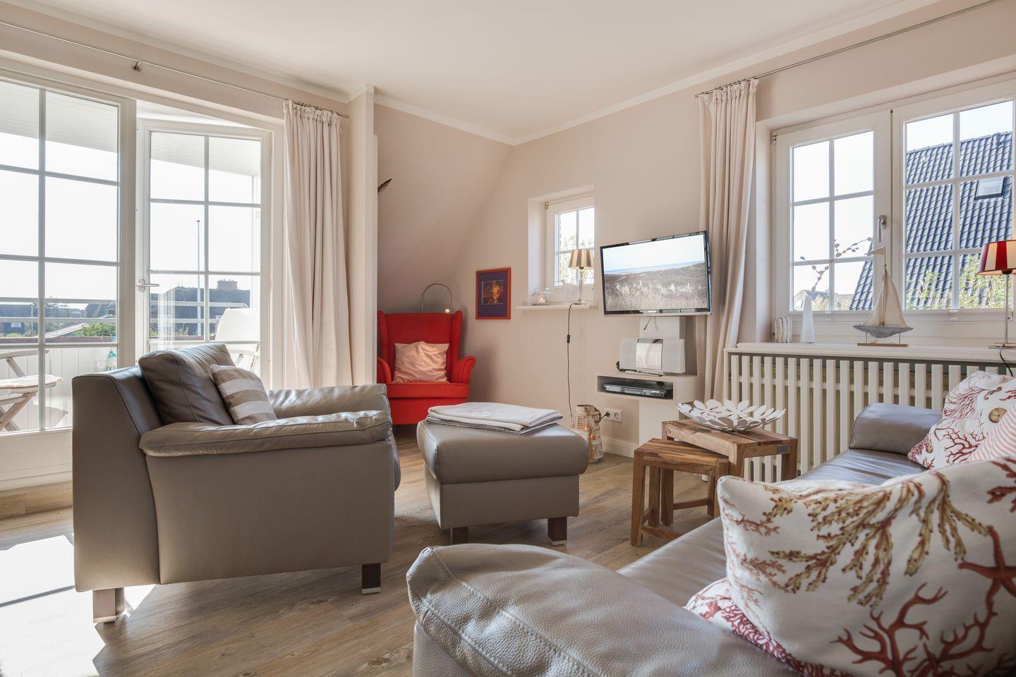 OG: Im nach Südwesten ausgerichteten, sonnendurchfluteten Wohnraum laden eine moderne Wohnlandschaft und eine gemütliche Leseecke zum Entspannen ein. Flat-TV (Kabel), DVD-Player, Kompakt-Stereoanlage, sowie Telefon sind ebenso selbstverständlich wie die Telefonflatrate ins deutsche Festnetz, Internetflatrate und WLAN/DSL-Anschluss.