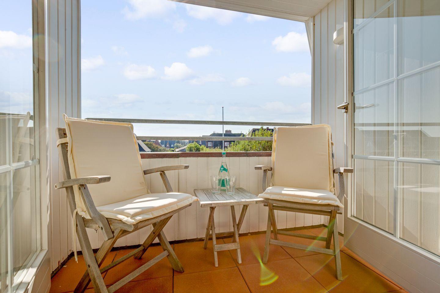 Ein gemütliches Plätzchen für zwei, für eine Pause zwischendurch oder um einen sonnigen Strandtag ausklingen zu lassen, finden Sie auf dem geschützten Südbalkon.