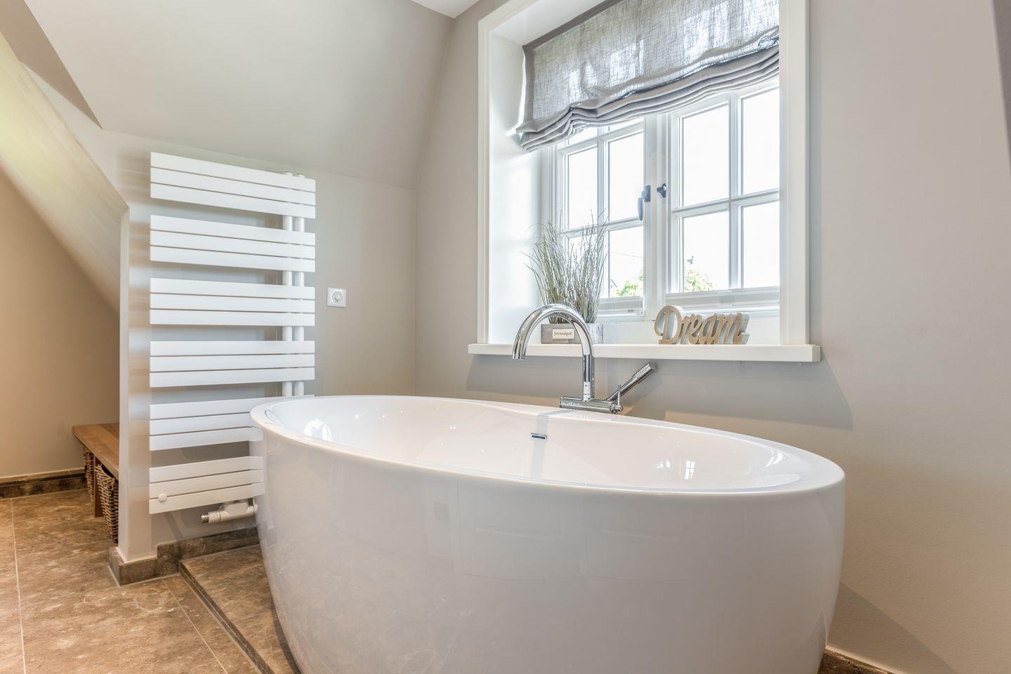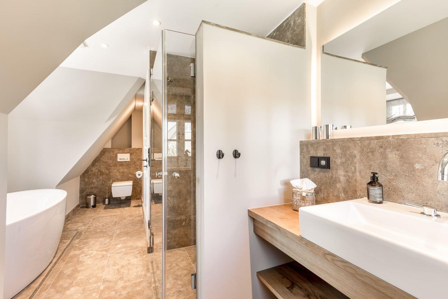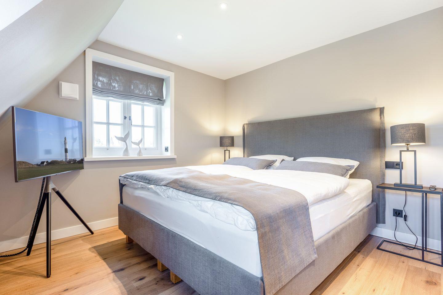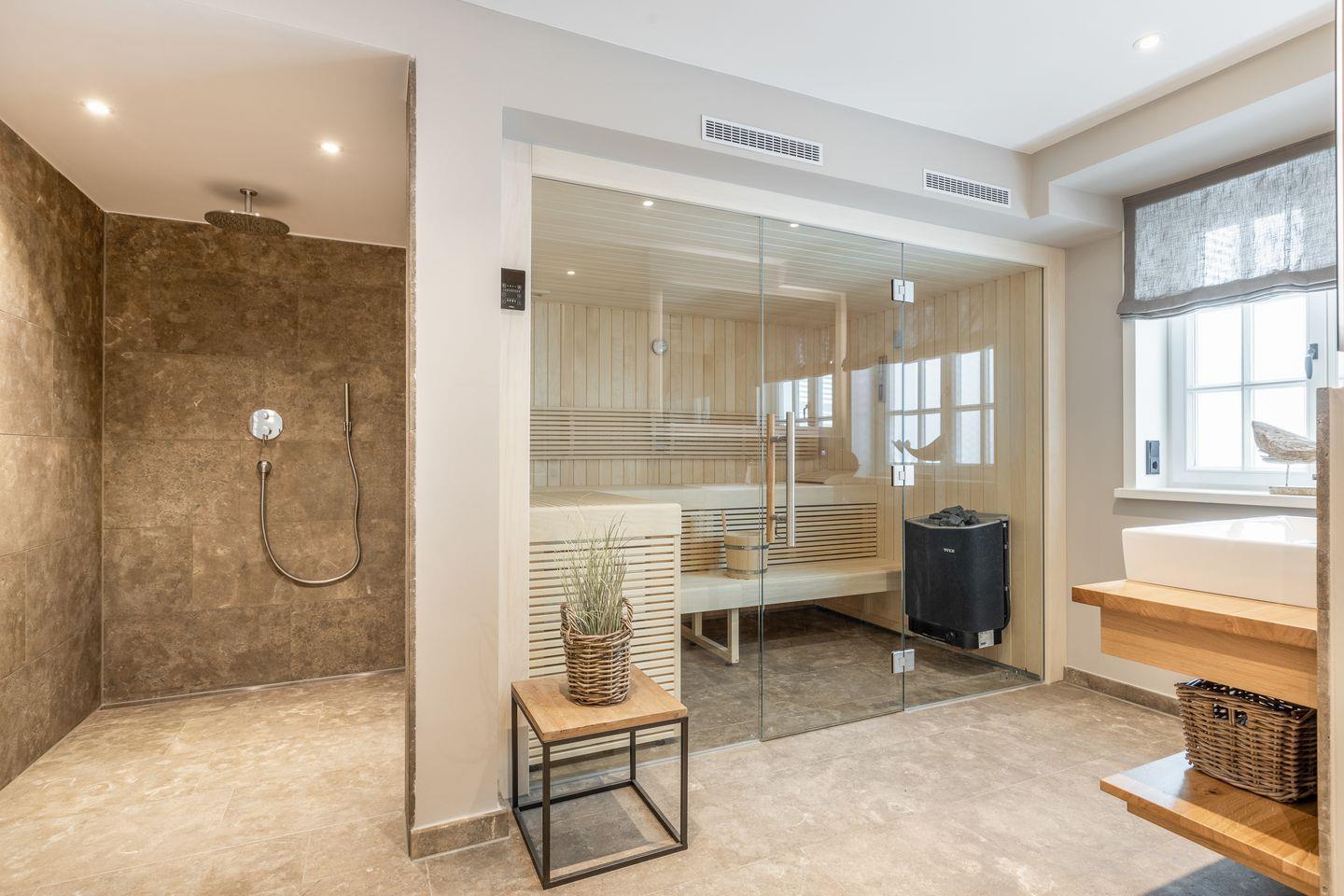 Im Obergeschoss des Hauses erwartet Sie ein Schlafzimmer mit Boxspring-Doppelbett und Flatscreen-TV sowie ein top-modernes Badezimmer mit Dusche und freistehender Badewanne, die zum Entspannen einlädt. Das Untergeschoss hält für Sie zwei weitere Räume mit je einem Boxspring-Doppelbett und Flatscreen-TV bereit. Eine weitere Besonderheit des Hauses ist das große Wellness-Badezimmer im Untergeschoss mit eigener Sauna, Regendusche und WC.