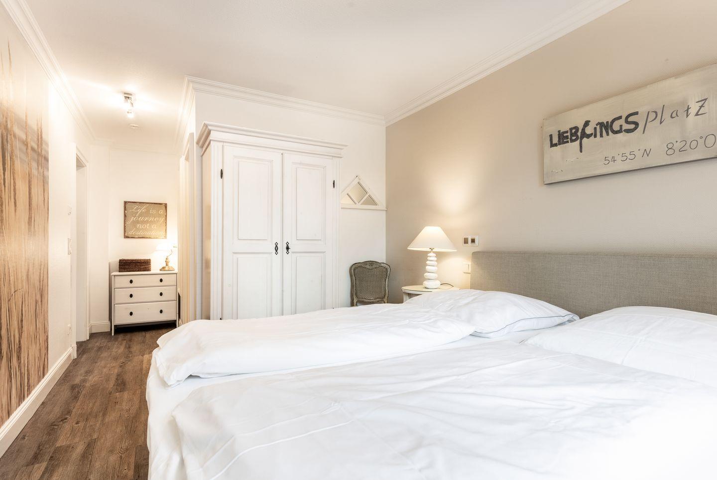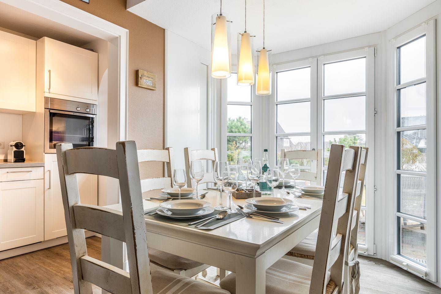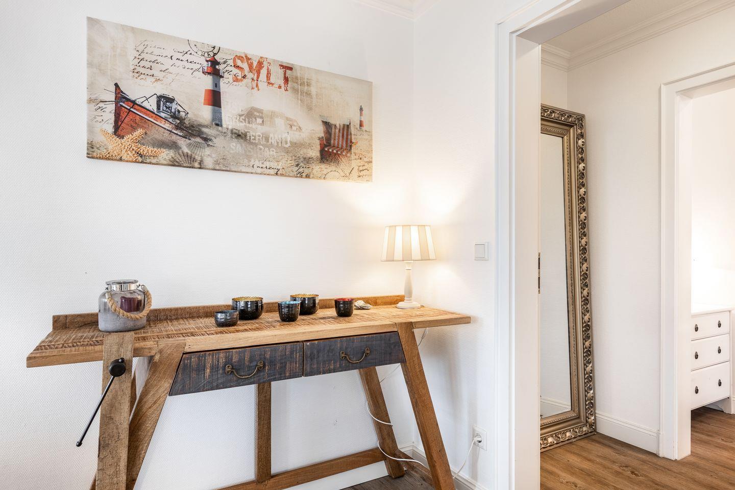 Ihre kleine, aber sehr feine und überkomplett ausgestattete Küche mit Geschirrspüler und Backofen lässt Herzen selbst ambitionierter Hobbyköche höher schlagen. Weiterhin finden Sie im Erdgeschoss ein sehr schön gestaltetes Schlafzimmer mit Doppelbett (1,8x2m), Wand-/Unterputzradio und Flat-TV. Ihr Wellness-En-Suite Bad mit XL-Dusche und WC lässt Sie beschwingt in den Tag kommen oder stilvoll Ihren Sylter Urlaubstag beschließen. Natürlich darf auch ein Gäste-WC im Entrée nicht fehlen.