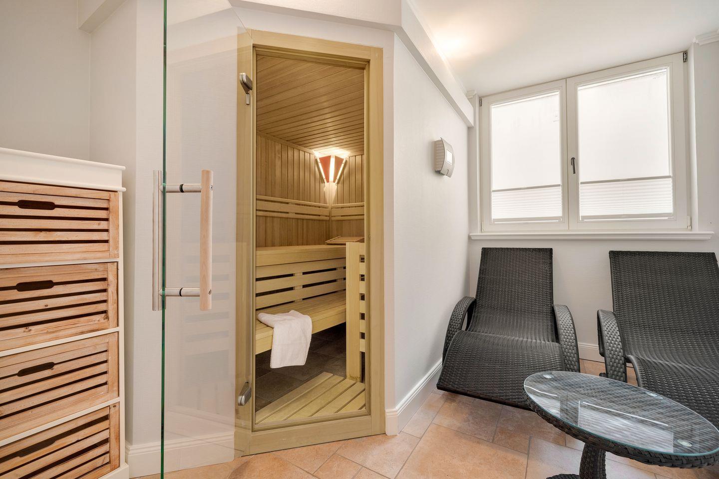 UG: Im Untergeschoss erwartet Sie ein weiterer, geschmackvoll designter Raum mit Boxspringbett (180x200cm) und Flat-TV. Sauna mit Farbtherapie und Relaxmöglichkeit auf zwei Liegen. Tolles Bad mit Wanne, großer Dusche, WC und Waschtisch.
