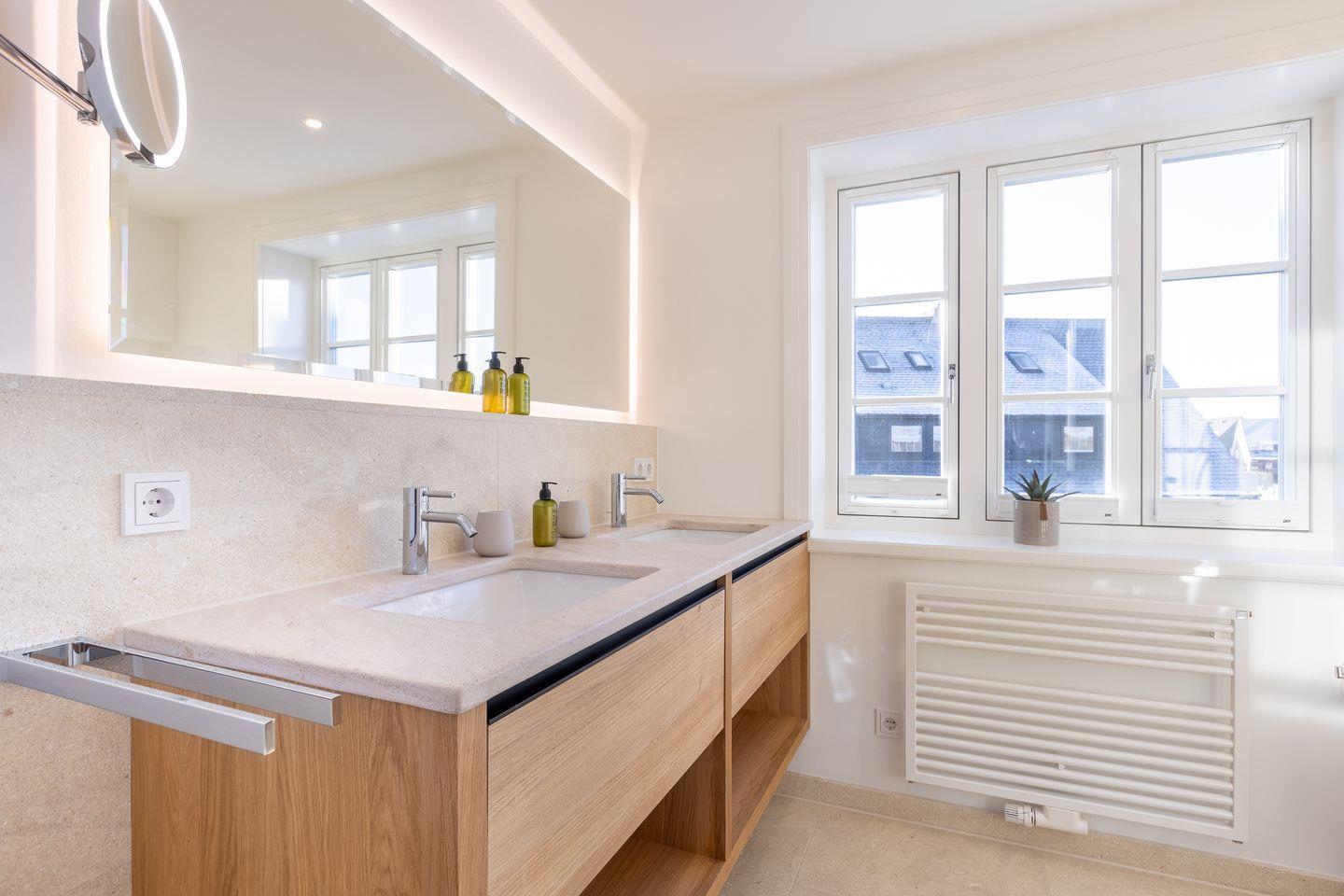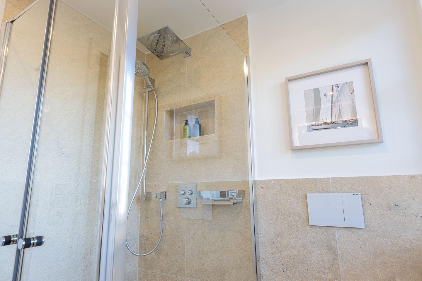 Im Obergeschoß befinden sich zwei weitere Schlafzimmer mit jeweils einem Doppelbett (180x200cm), TV und zwei Duschbädern. Im Masterschlafzimmer liegt das Bad ensuite.