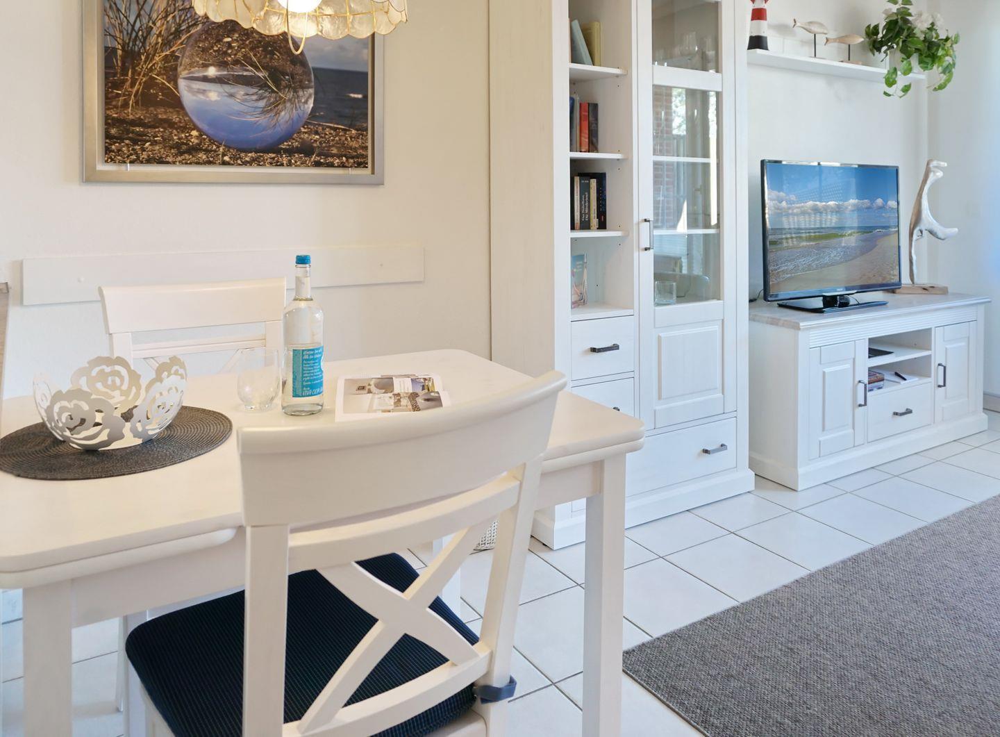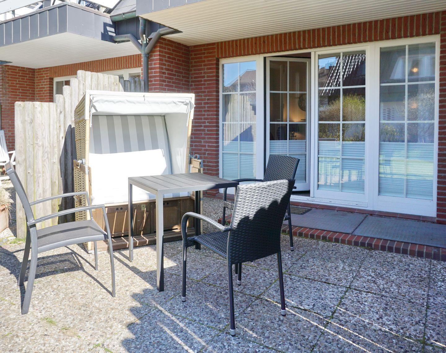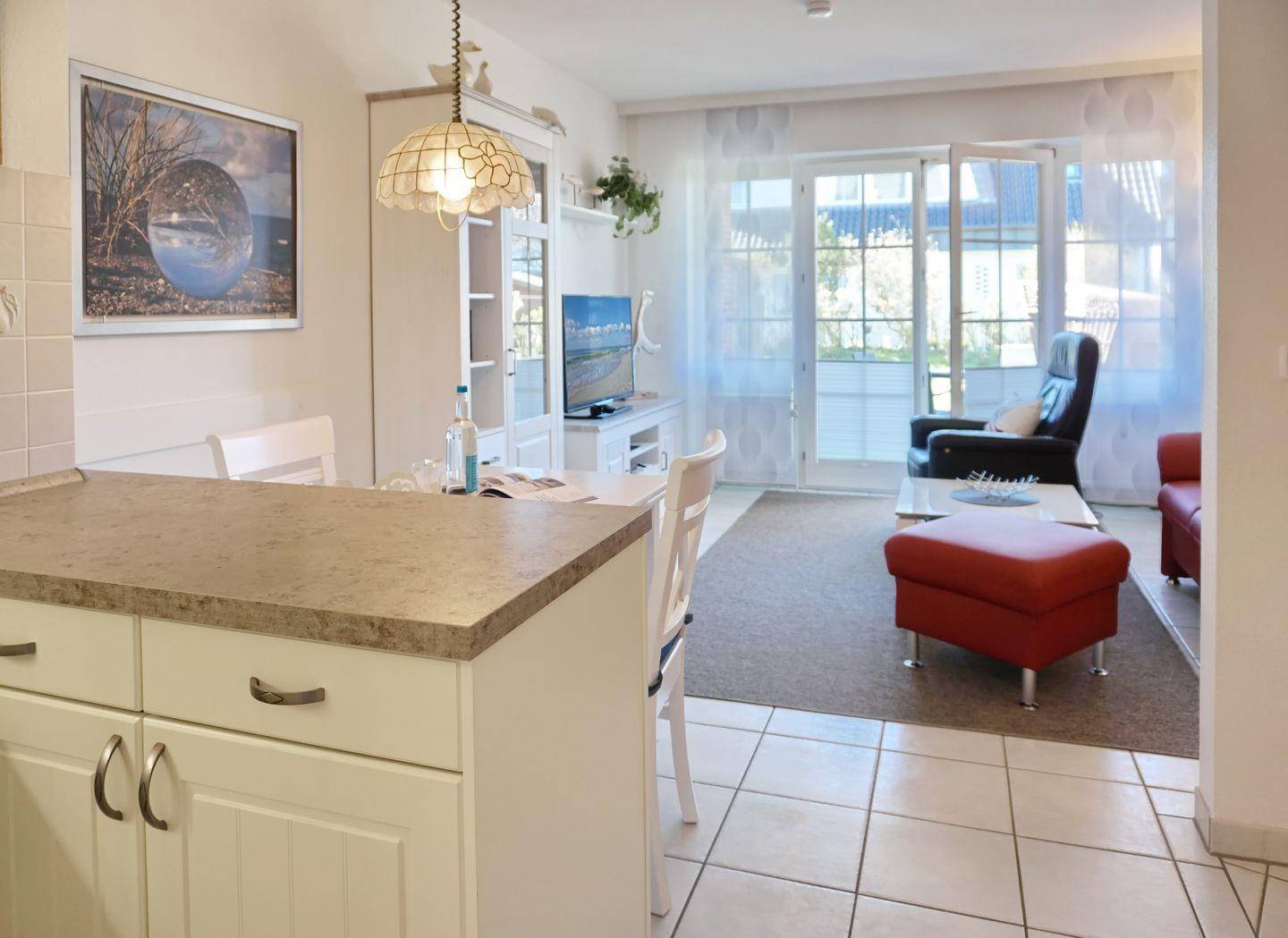 Der Wohnraum des Domizils bietet Ihnen eine große Couchecke zum Entspannen und durch die bodentiefen Fenster fällt viel Licht in das Wohnzimmer. Am geräumigen Esstisch können Sie Ihre Urlaubsleckereien genießen und die offene Küche bietet Ihnen mit ihrer vollen Ausstattung alles, was das Urlaubsherz begehrt. Vom Wohnraum aus betreten Sie Ihre sonnige Süd-Terrasse, die von April bis Oktober möbliert ist. Im Erdgeschoss der Wohnung finden Sie außerdem ein Gäste-WC.