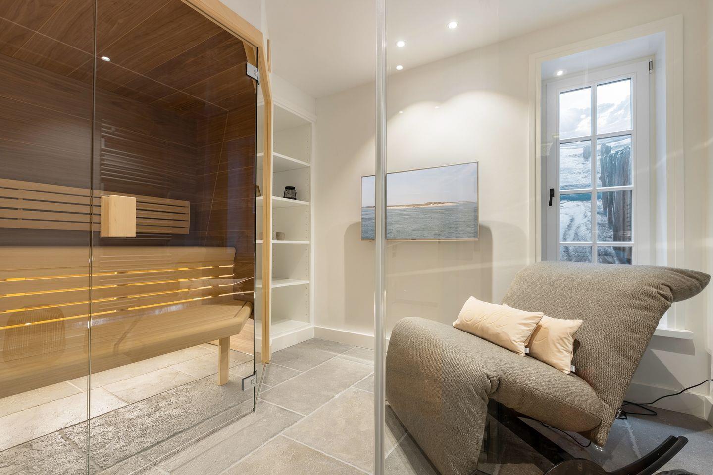 Untergeschoss: 1 Raum mit Doppelbett (180 x 200cm) und Bad en Suite mit Dusche / WC. Ein zusätzlicher Raum kann als Office benutzt werden und ist zusätzlich mit einer Schlafcouch (160 x 200cm) versehen. In der großzügigen Sauna mit Dusche können Sie wunderbar entspannen. In der Dusche steht auch ein Schlauch zum Kneippen zur Verfügung. Nach dem Saunagang können Sie es sich auf Ihrem elektrisch verstellbaren Liegestuhl bequem machen. Zusätzlich befindet sich auf dieser Ebene noch die Waschmaschine sowie ein Trockner.