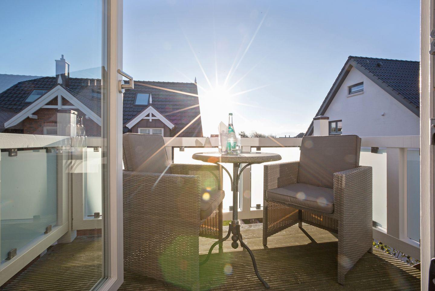 Vom Wohnraum aus erreichen Sie den möblierten Balkon, auf dem Sie im Sommer ein leckeres Abendessen genießen können, das Sie in der top-ausgestatteten Küche des Appartements zubereitet haben. Die Wohnung besticht durch eine außergewöhnliche und moderne Ausstattung, die Ihren Sylt-Aufenthalt zu etwas ganz Besonderem macht. Die Wohnung verfügt über ein helles Tageslichtbad mit Dusche und WC.