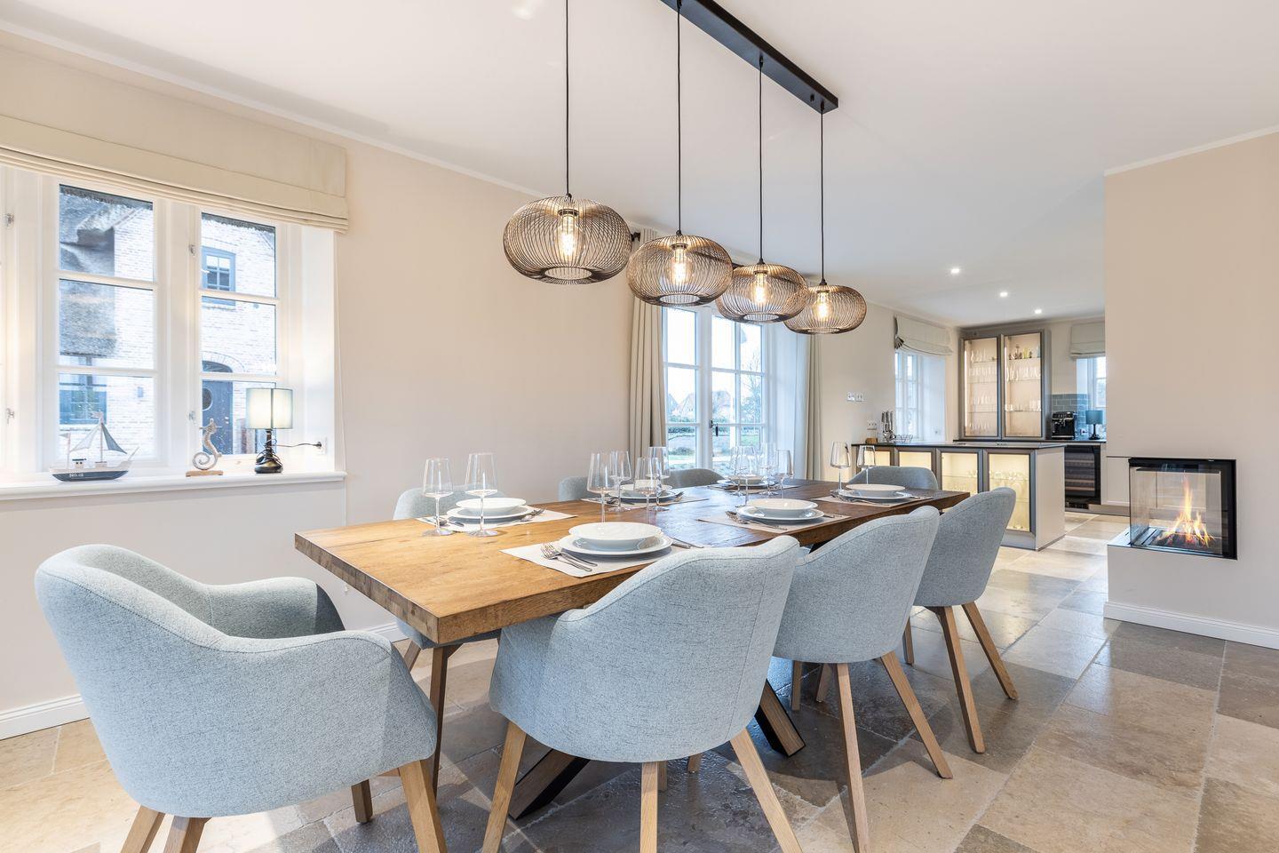 EG: Wohnraum mit Flatscreen-TV, Kamin, großer Essbereich, offene Küche mit Mikrowelle-Backofen-Kombi, Geschirrspülmaschine, Induktionsherd, Weinkühlschrank, Nespressomaschine, zwei Terrassen mit Gartenmöbeln und Strandkorb (April-Oktober), Gäste-WC, ein Schlafraum mit Doppelbett (160x200cm)