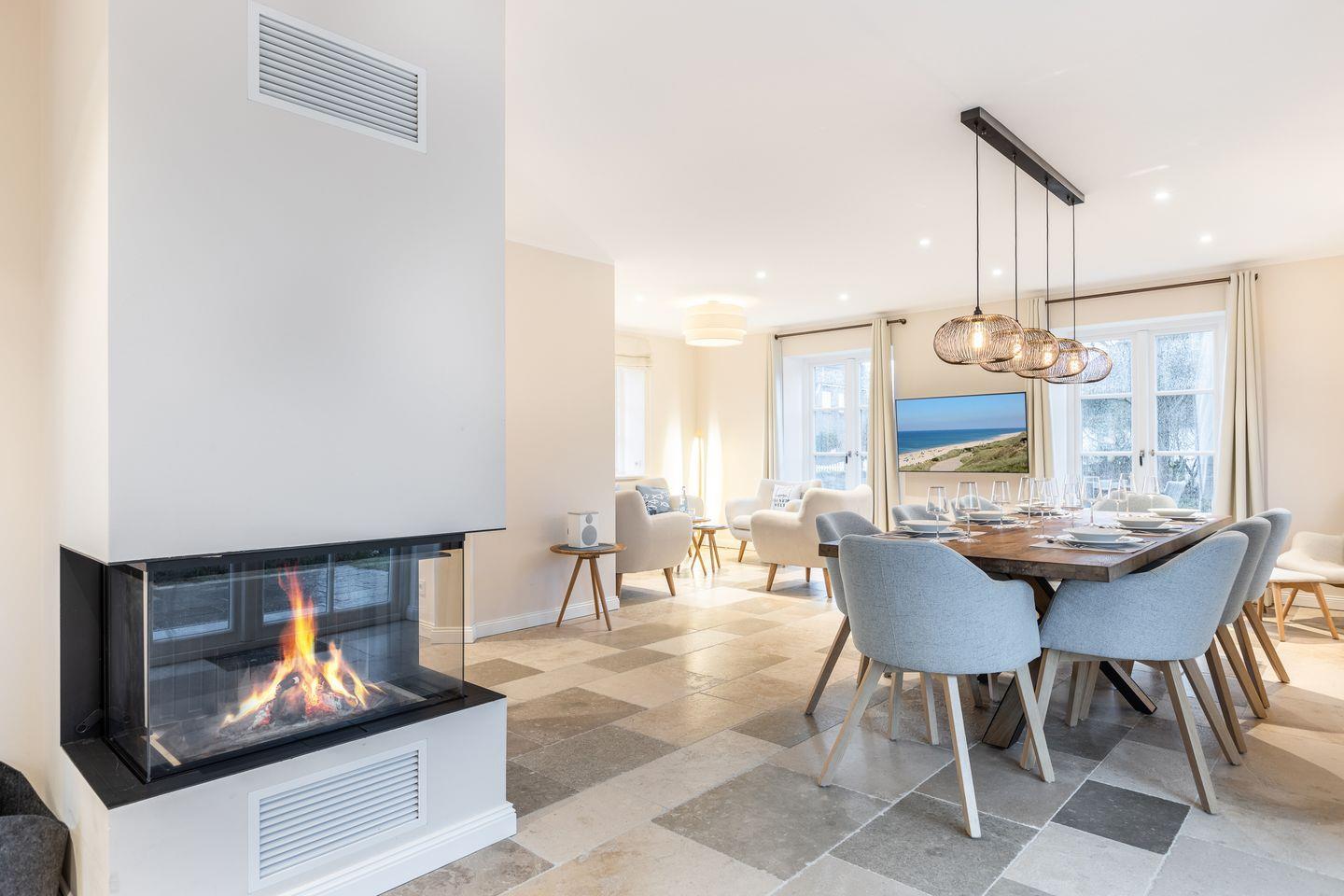 Ein wahrer Sylter Urlaubstraum erwartet Sie im Haus Hiirbloom in Wenningstedt mit reichlich Platz für bis zu acht Personen, die sich hier wohl fühlen dürfen. Ein großer, lichtdurchfluteter Wohnraum mit Kamin bildet den Mittelpunkt des Hauses, das geschmackvoll und nach modernstem Standard eingerichtet ist. Neben einer gemütlichen Couckecke mit Sesseln erwartet Sie ein großer Esstisch mit gemütlichen Stühlen sowie eine offene, top-moderne Küche. Vom Induktionskochfeld bis zum Kaffeevollautomaten finden Sie hier alles, was Ihr Urlaubsherz begehrt. Vom Wohnbereich aus betreten Sie den Außenbereich mit zwei möblierten Terrassen, auf denen Sie die Sylter Sonnenstunden genießen können. Ebenfalls im Erdgeschoss des Hauses befindet sich ein Schlafzimmer mit Doppelbett und ein Gäste-WC.
