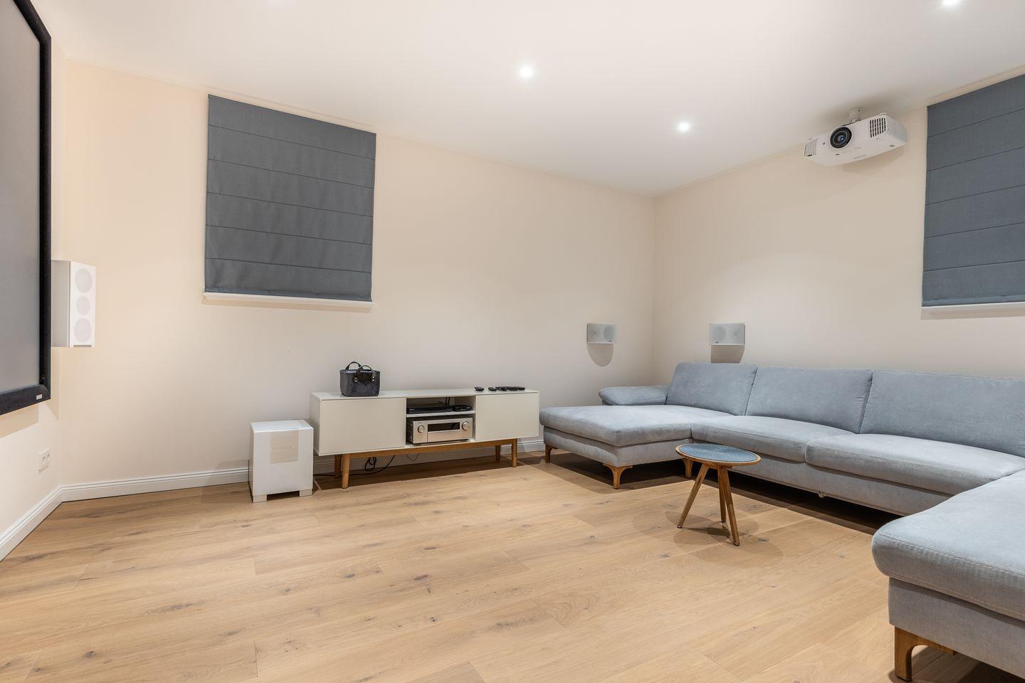 UG: ein Raum mit Doppelbett und Flatscreen-TV, Waschküche mit Waschmaschine und Trockner, ein Badezimmer mit Dusche und WC, große Sauna, Heimkino mit großer Leinwand, Surroundsystem und Sofalandschaft