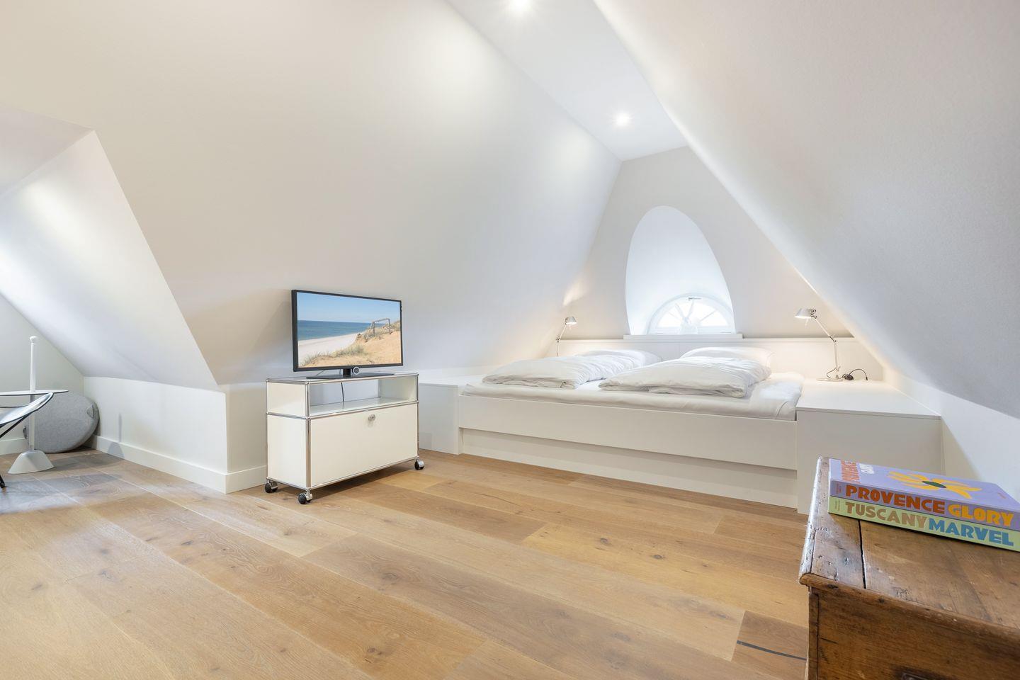 OG: ein Raum mit Doppelbett, TV und en Suite Bad mit Dusche und Badewanne, separates WC.