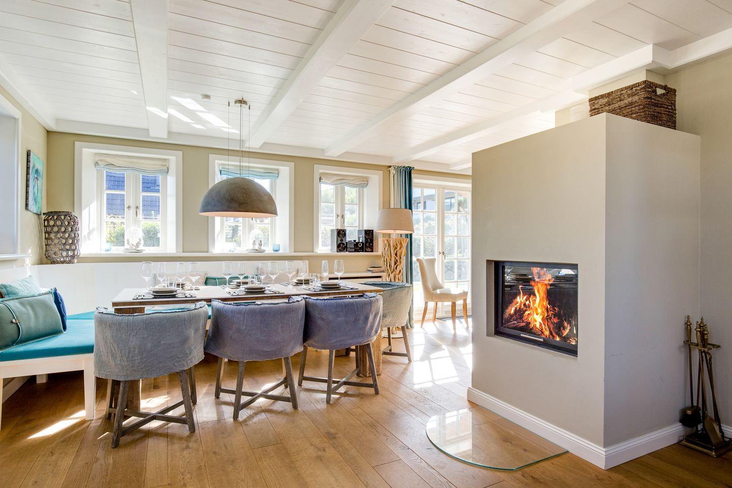 Zwischen Wohnbereich und Küche zaubert ein holzbefeuerter Kamin Wärme für's Auge und Herz.