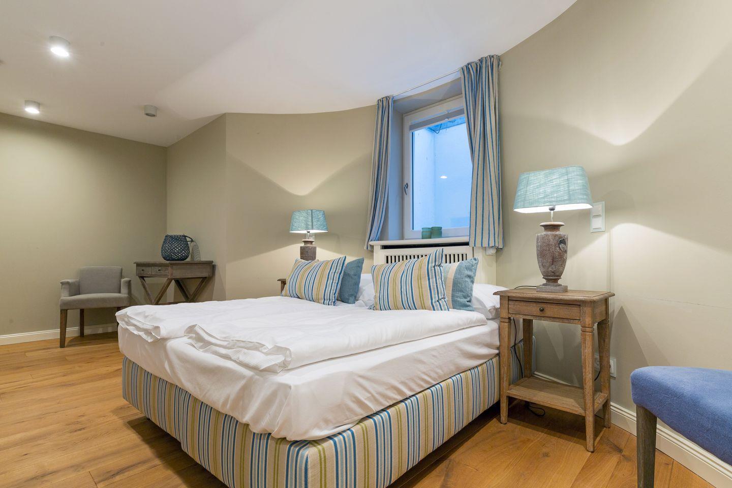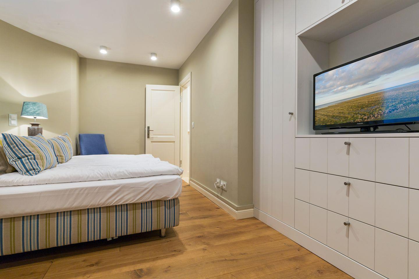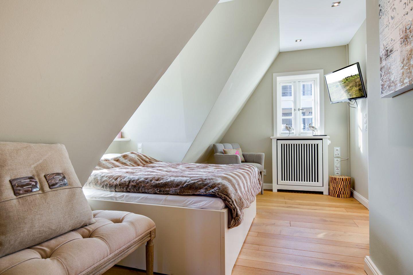Im Obergeschoss finden Sie einen äußerst geschmackvoll designten Masterbedroom mit Flat-TV vor. Ihr Doppelbett (ca. 2x2m) sorgt für traumhaften Schlaf. Benachbart finden Sie ein weiteres Schlafzimmer mit eingebautem Doppelbett und Flat-TV vor (ca. 1,4x2m, durch den Erkereinbau verjüngt sich das Bett leicht). Sehr schönes En-Suite Bad mit großer Dusche, WC und feinem Waschtisch.