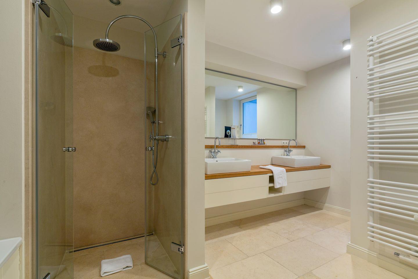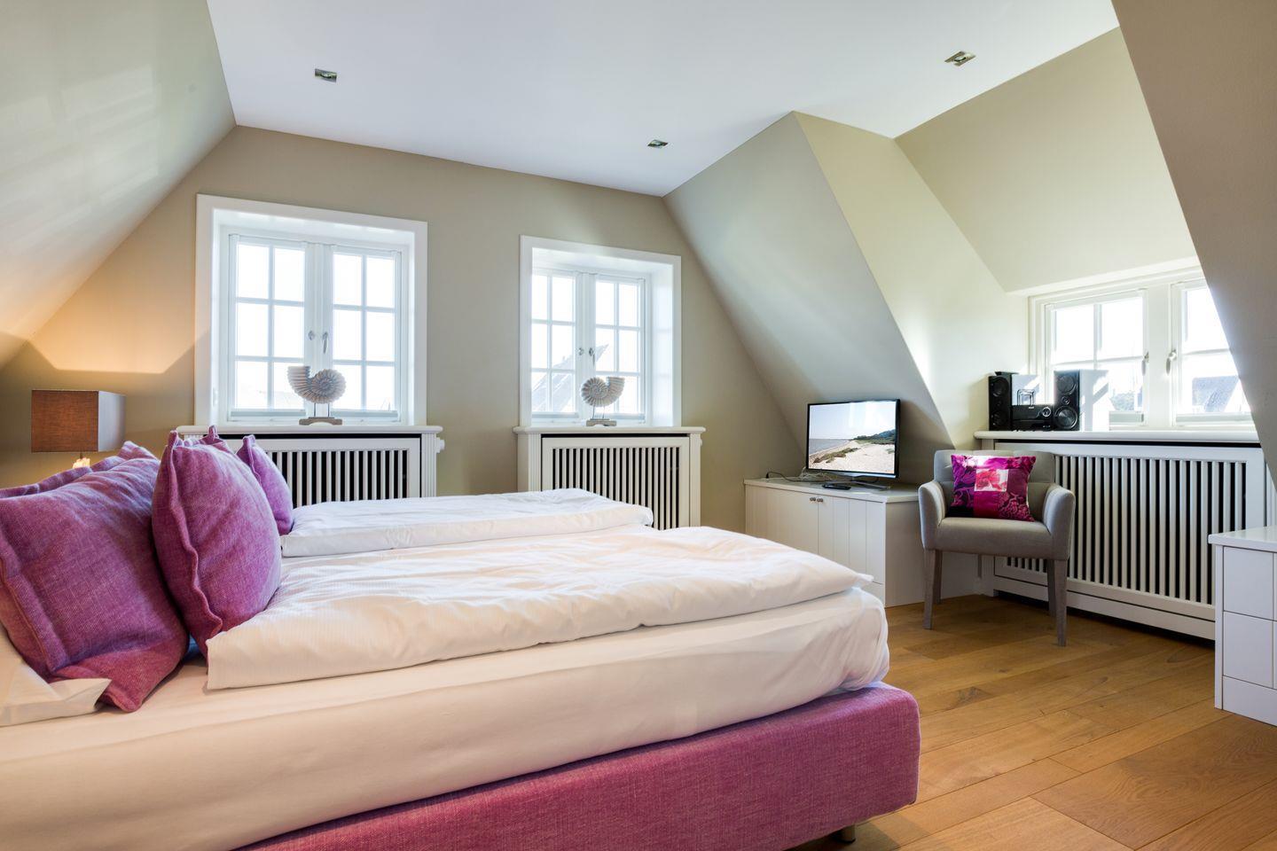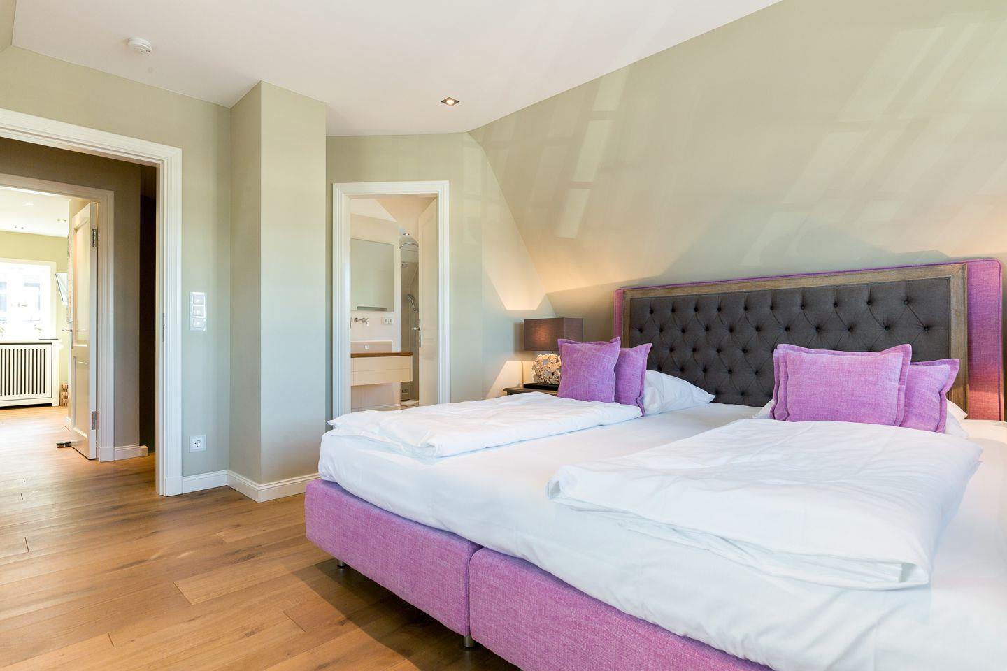 Im Obergeschoss finden Sie einen äußerst geschmackvoll designten Masterbedroom mit Flat-TV vor. Ihr Doppelbett (ca. 2x2m) sorgt für traumhaften Schlaf. Benachbart finden Sie ein weiteres Schlafzimmer mit eingebautem Doppelbett und Flat-TV vor (ca. 1,4x2m, durch den Erkereinbau verjüngt sich das Bett leicht). Sehr schönes En-Suite Bad mit großer Dusche, WC und feinem Waschtisch.