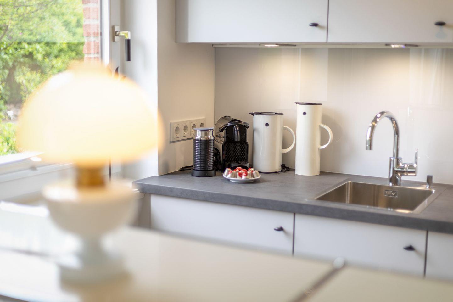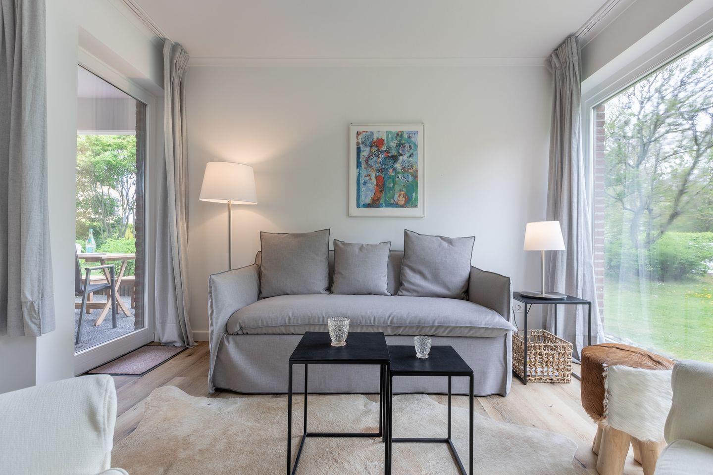 Wohnzimmer mit Flatscreen TV, CD-Player, Radio und W-LAN, Küchenzeile ausgestattet mit Spülmaschine, Mikrowellen-Backofen Kombination, Nespressomaschine und Wasserkocher, Wohnraum mit Couch mit zusätzlicher Schlaffunktion, ein Schlafraum mit Doppelbett (180x200cm) und TV, Badezimmer mit Dusche, WC, Schminkspiegel, Fön, Garten mit Terrasse, Gartenmöbeln und Strandkorb, eigene Waschmaschine mit integriertem Trockner, in dem Küchenschrank, in der Wohnung.