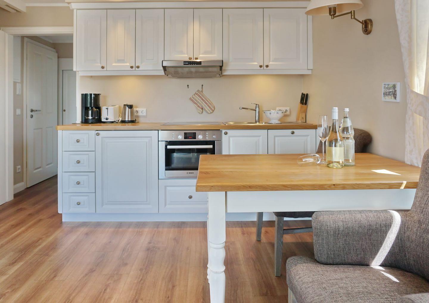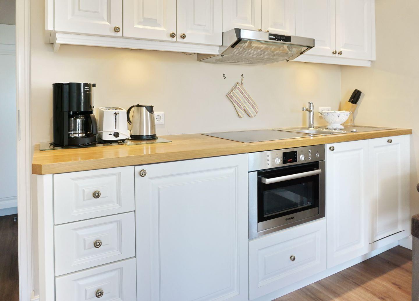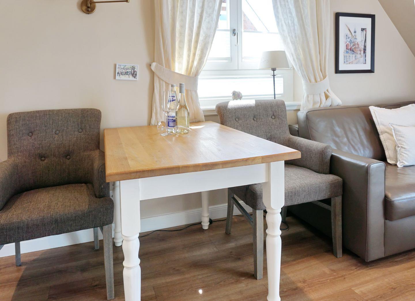 OG: Wohnraum mit TV, W-Lan, Essbereich, offene Küche mit Backofen-Microwellen-Kombi, Geschirrspüler, Kochfeld, Balkon mit Gartenmöbeln (April-Oktober). Badezimmer mit Dusche und WC. Waschmaschine zur Eigennutzung vorhanden.