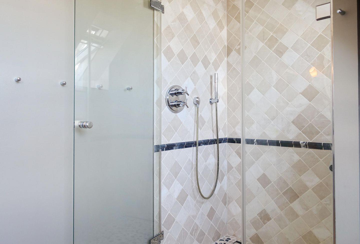 Ein Raum mit Doppelbett (180x200cm) und TV. Badezimmer mit Dusche und WC.