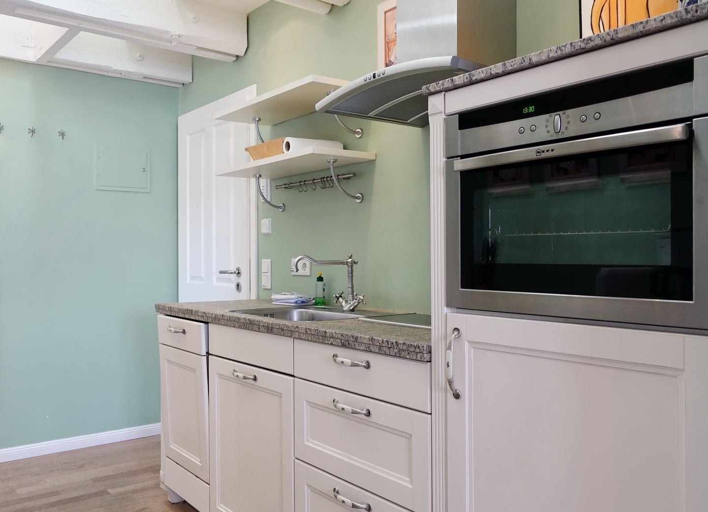 OG: Wohnraum mit TV, W-Lan, Essbereich, offene Küche mit Backofen, Geschirrspüler, Toaster, Filterkaffeemaschine, Wasserkocher, Kochfeld. Zwei Balkone mit Gartenmöbeln (April-Oktober).
