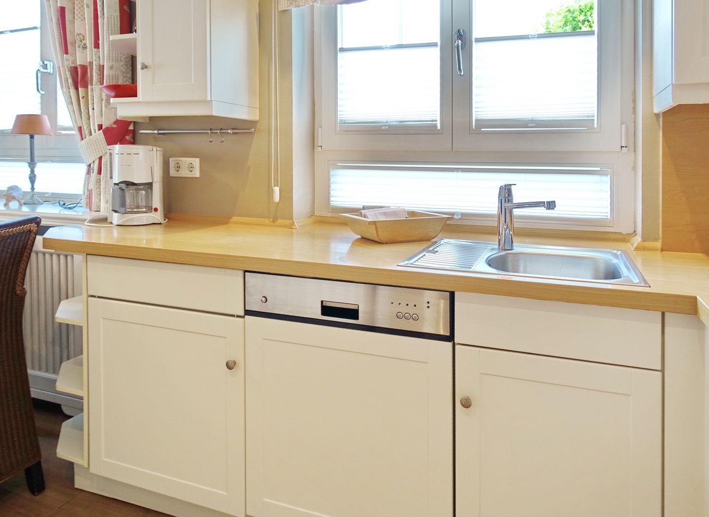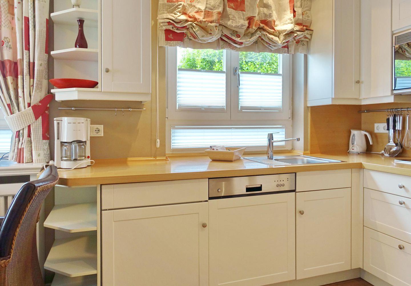 EG: Wohnraum mit TV, W-Lan, Essbereich, Küchenzeile mit Geschirrspüler, Microwelle, kleines Kochfeld, Terrasse mit Gartenmöbeln und Strandkorb (April-Oktober). Gäste-WC.